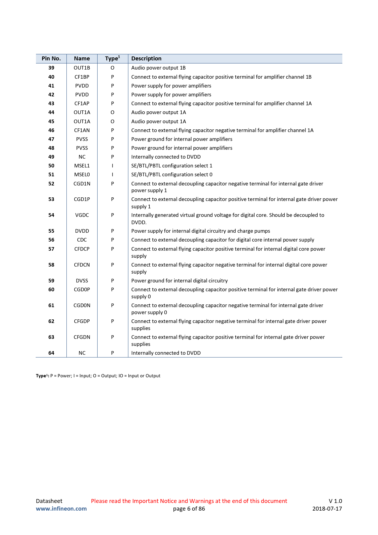 P = Power; I = Input; O = Output; IO = Input or Output Datasheet Please read the Important Notice and Warnings at the end of this document V 1.0