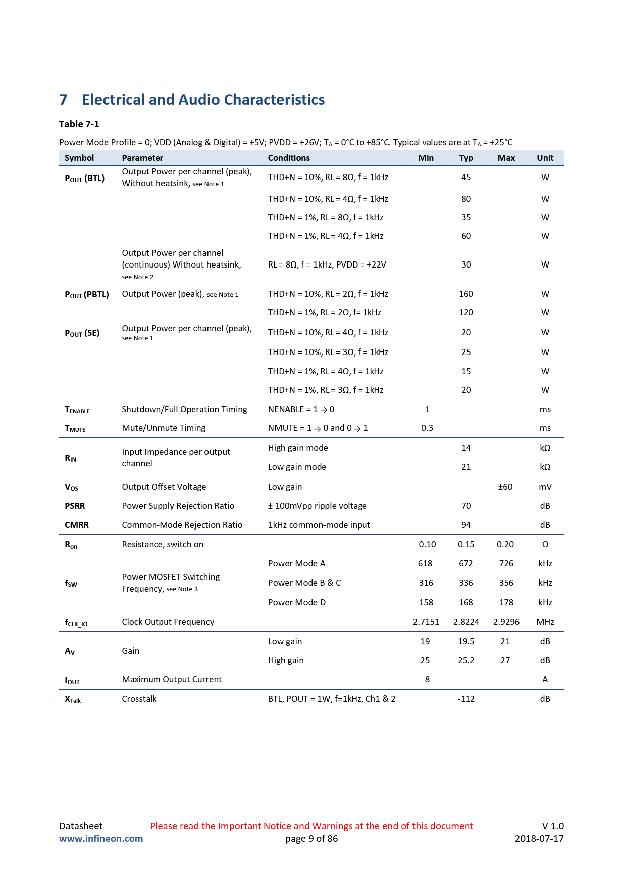 7 Electrical and Audio Characteristics Table 7-1 Symbol Parameter Conditions Min Typ Max Unit POUT (BTL) POUT (PBTL) POUT (SE)