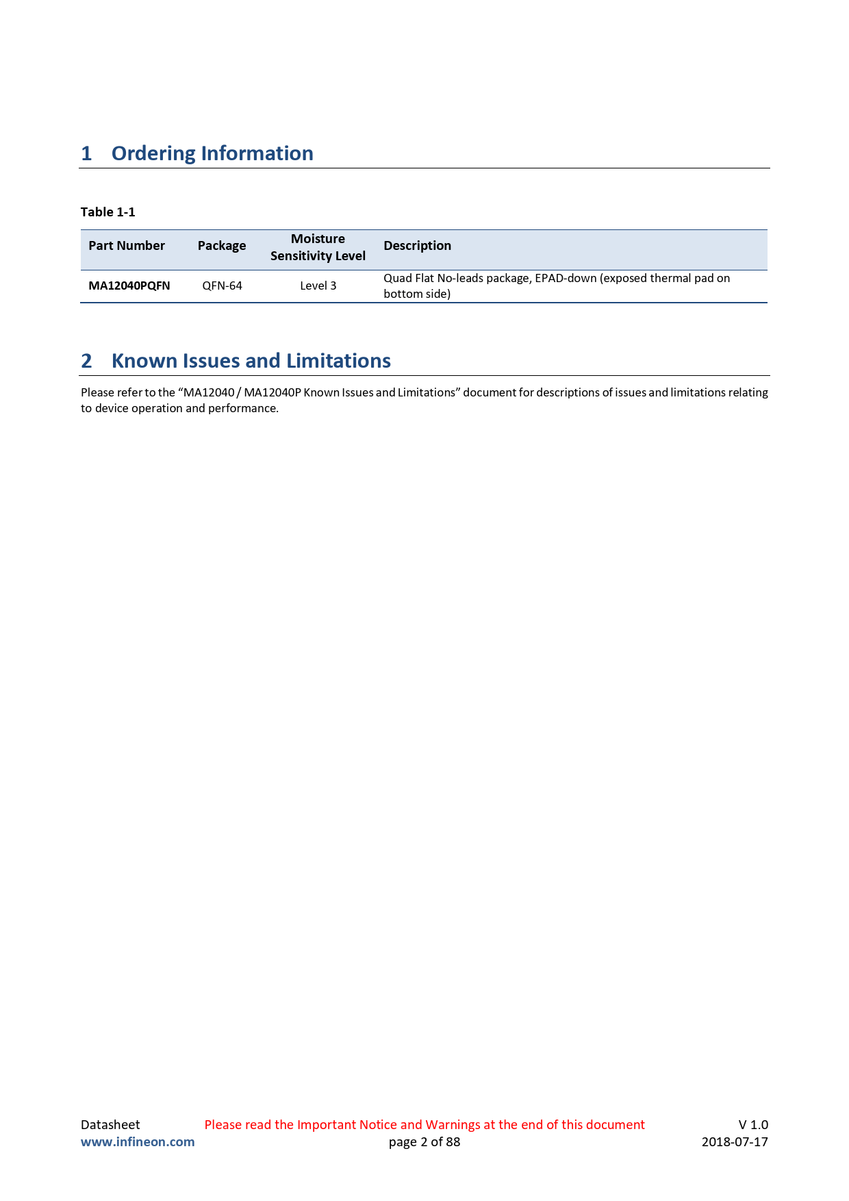 Please refer to the “MA12040 / MA12040P Known Issues and Limitations” document for descriptions of issues and limitations relating to device operation and performance. Datasheet Please read the Important Notice and Warnings at the end of this document V 1.0