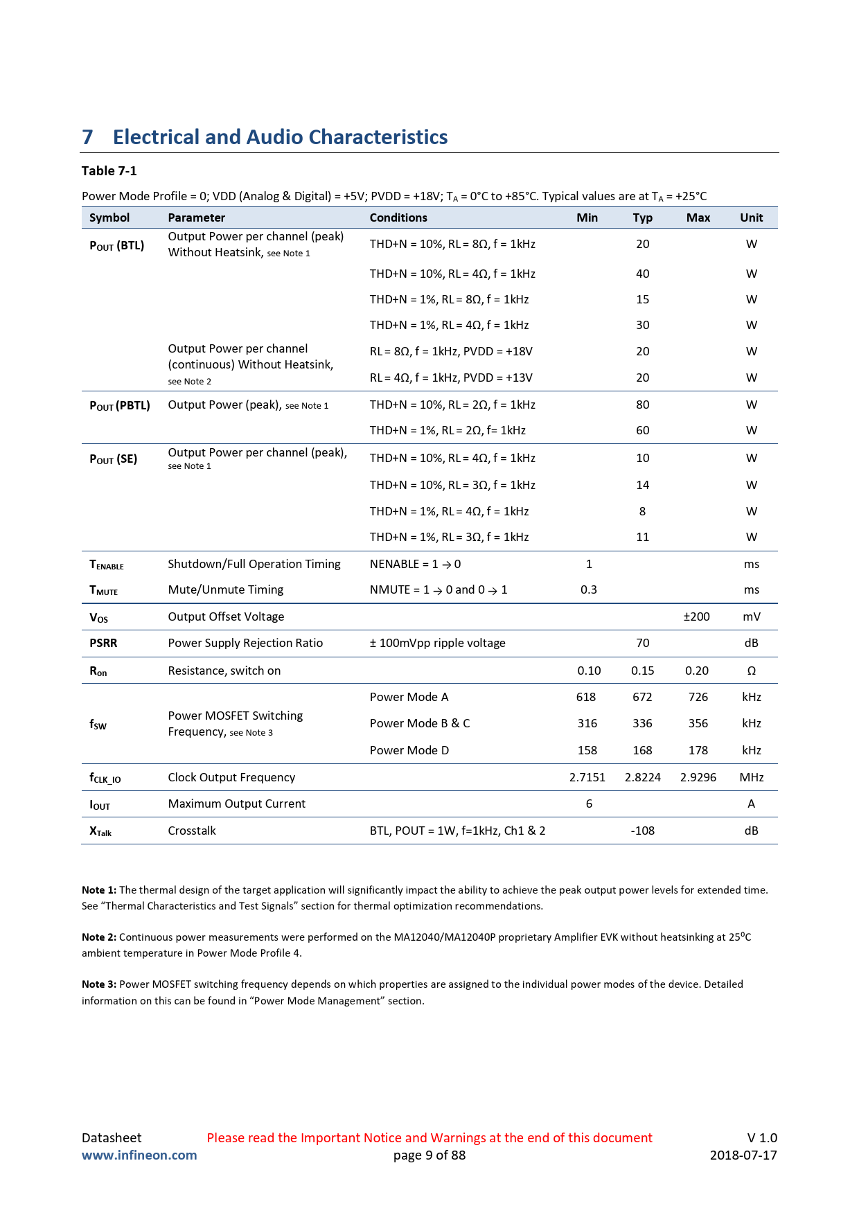 7 Electrical and Audio Characteristics Table 7-1 Symbol Parameter Conditions Min Typ Max Unit POUT (BTL) POUT (PBTL) POUT (SE)