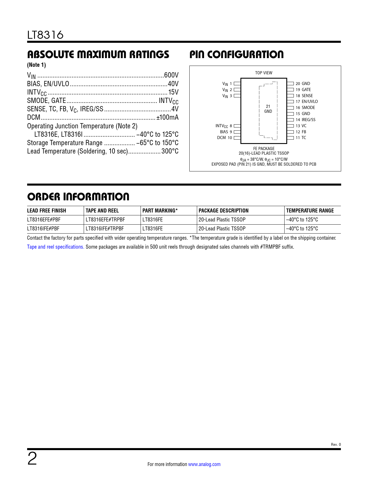 LT8316EFE#PBF LT8316EFE#TRPBF LT8316FE 20-Lead Plastic TSSOP –40°C to 125°C LT8316IFE#PBF LT8316IFE#TRPBF LT8316FE 20-Lead Plastic TSSOP –40°C to 125°C Contact the factory for parts specified with wider operating temperature ranges. *The temperature grade is identified by a label on the shipping container. Tape and reel specifications. Some packages are available in 500 unit reels through designated sales channels with #TRMPBF suffix. Rev. 0 2 For more information www.analog.com Document Outline Features Applications Typical Application Description Absolute Maximum Ratings Order Information Pin Configuration Electrical Characteristics Typical Performance Characteristics Pin Functions Block Diagram Operation Applications Information Package Description Typical Application Related Parts