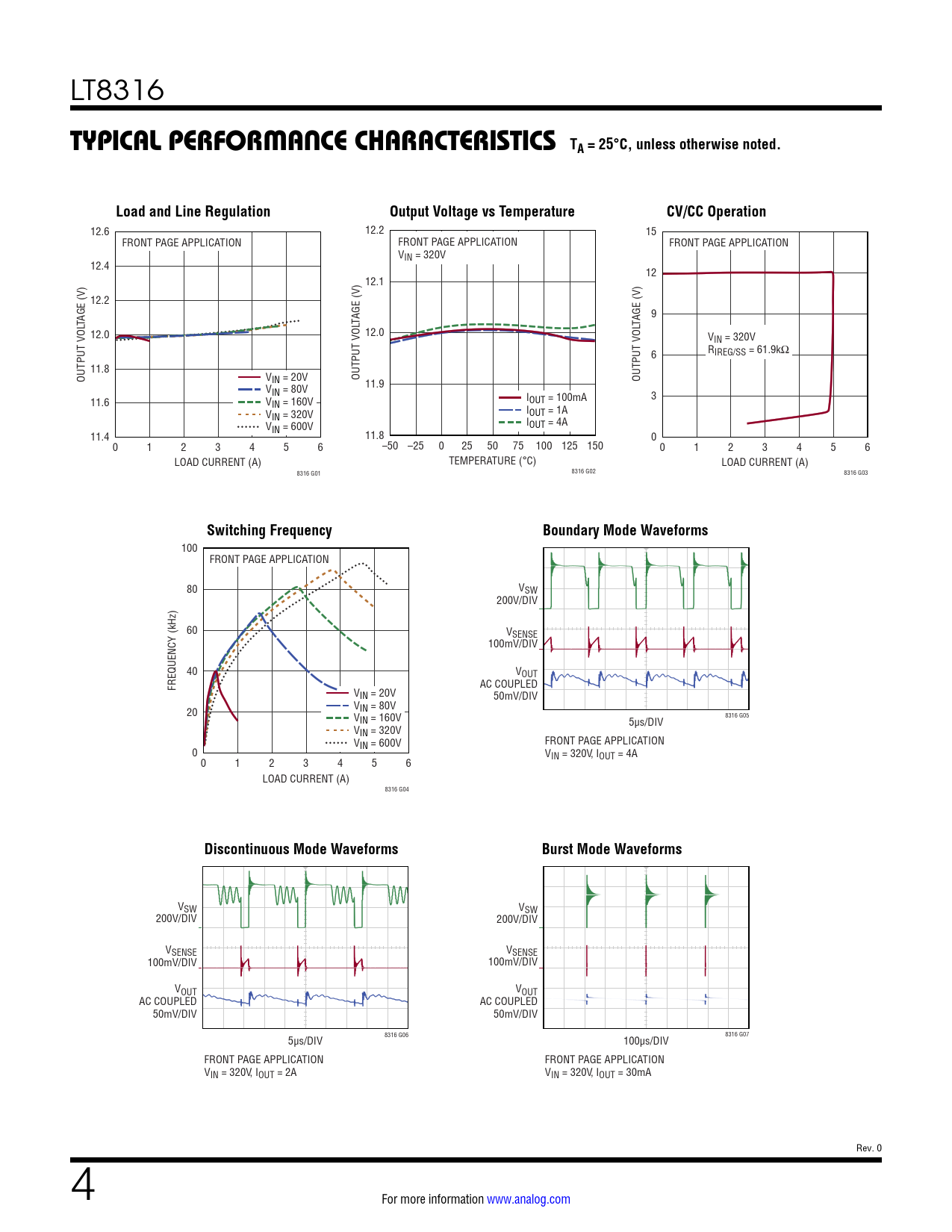 VSW VSW 200V/DIV 200V/DIV VSENSE VSENSE 100mV/DIV 100mV/DIV VOUT VOUT AC COUPLED AC COUPLED 50mV/DIV 50mV/DIV 5µs/DIV 8316 G06 100µs/DIV 8316 G07 FRONT PAGE APPLICATION FRONT PAGE APPLICATION VIN = 320V, IOUT = 2A VIN = 320V, IOUT = 30mA Rev. 0 4 For more information www.analog.com Document Outline Features Applications Typical Application Description Absolute Maximum Ratings Order Information Pin Configuration Electrical Characteristics Typical Performance Characteristics Pin Functions Block Diagram Operation Applications Information Package Description Typical Application Related Parts
