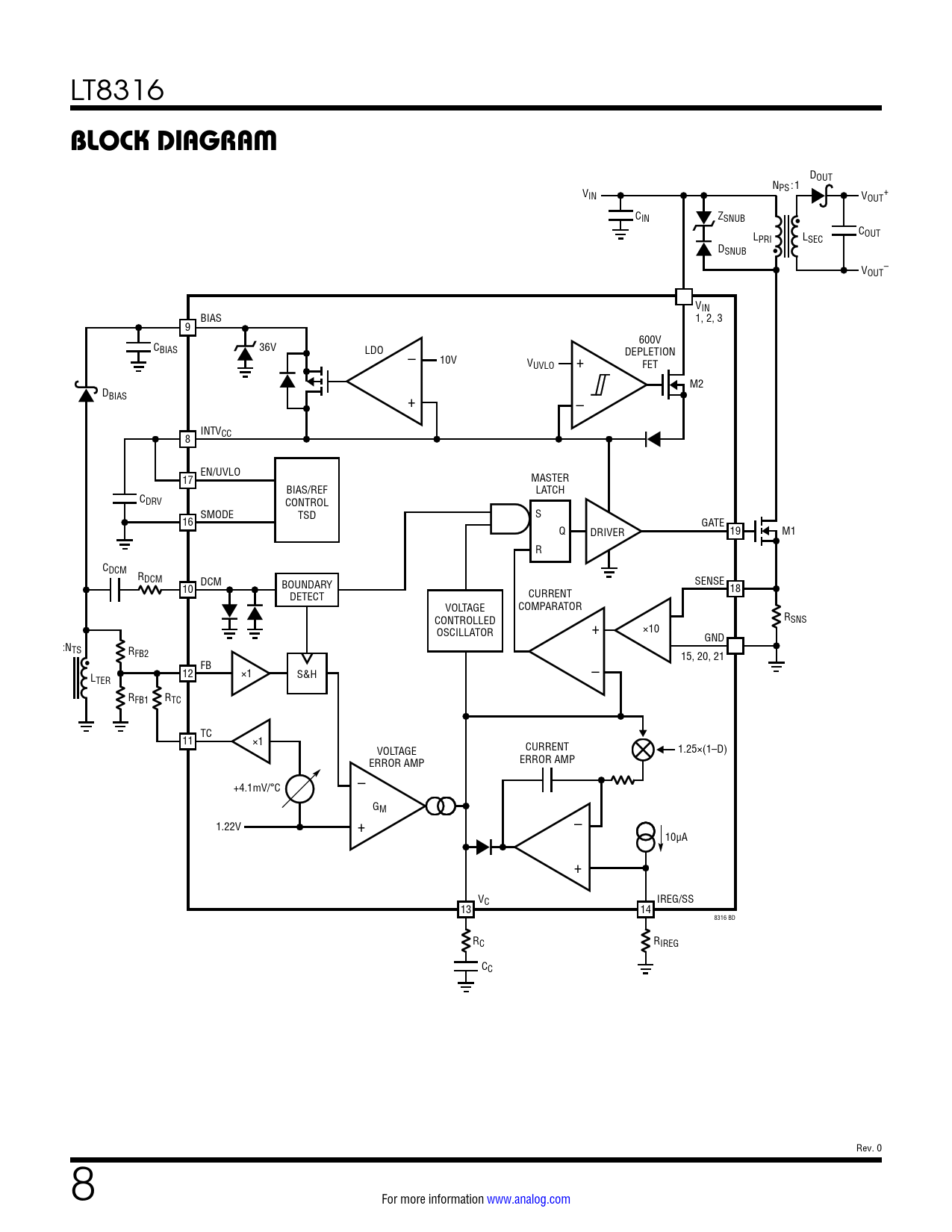 DOUT NPS:1 VIN V + OUT CIN ZSNUB • L C PRI LSEC OUT DSNUB • V – OUT VIN BIAS 1, 2, 3 9 600V CBIAS 36V LDO – DEPLETION 10V VUVLO + FET M2 DBIAS + – INTVCC 8 EN/UVLO 17 MASTER BIAS/REF LATCH CDRV CONTROL SMODE TSD S 16 GATE Q DRIVER 19 M1 R CDCM RDCM DCM SENSE 10 BOUNDARY 18 DETECT CURRENT VOLTAGE COMPARATOR CONTROLLED RSNS OSCILLATOR + ×10 GND :NTS RFB2 • 15, 20, 21 FB 12 ×1 S&H L – TER RFB1 RTC TC 11 ×1 VOLTAGE CURRENT 1.25×(1–D) ERROR AMP ERROR AMP +4.1mV/°C – GM 1.22V + – 10µA + VC IREG/SS 13 14 8316 BD RC RIREG CC Rev. 0 8 For more information www.analog.com Document Outline Features Applications Typical Application Description Absolute Maximum Ratings Order Information Pin Configuration Electrical Characteristics Typical Performance Characteristics Pin Functions Block Diagram Operation Applications Information Package Description Typical Application Related Parts