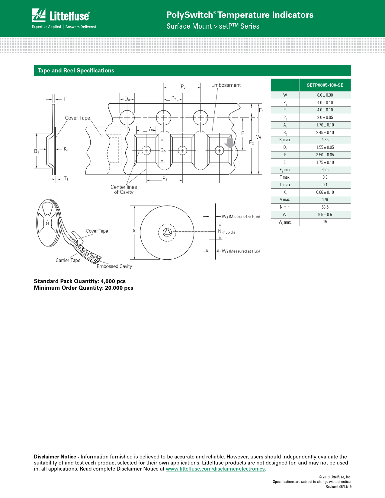 PolySwitch® Temperature Indicators. Tape and Reel Specifications. SETP0805-100-SE