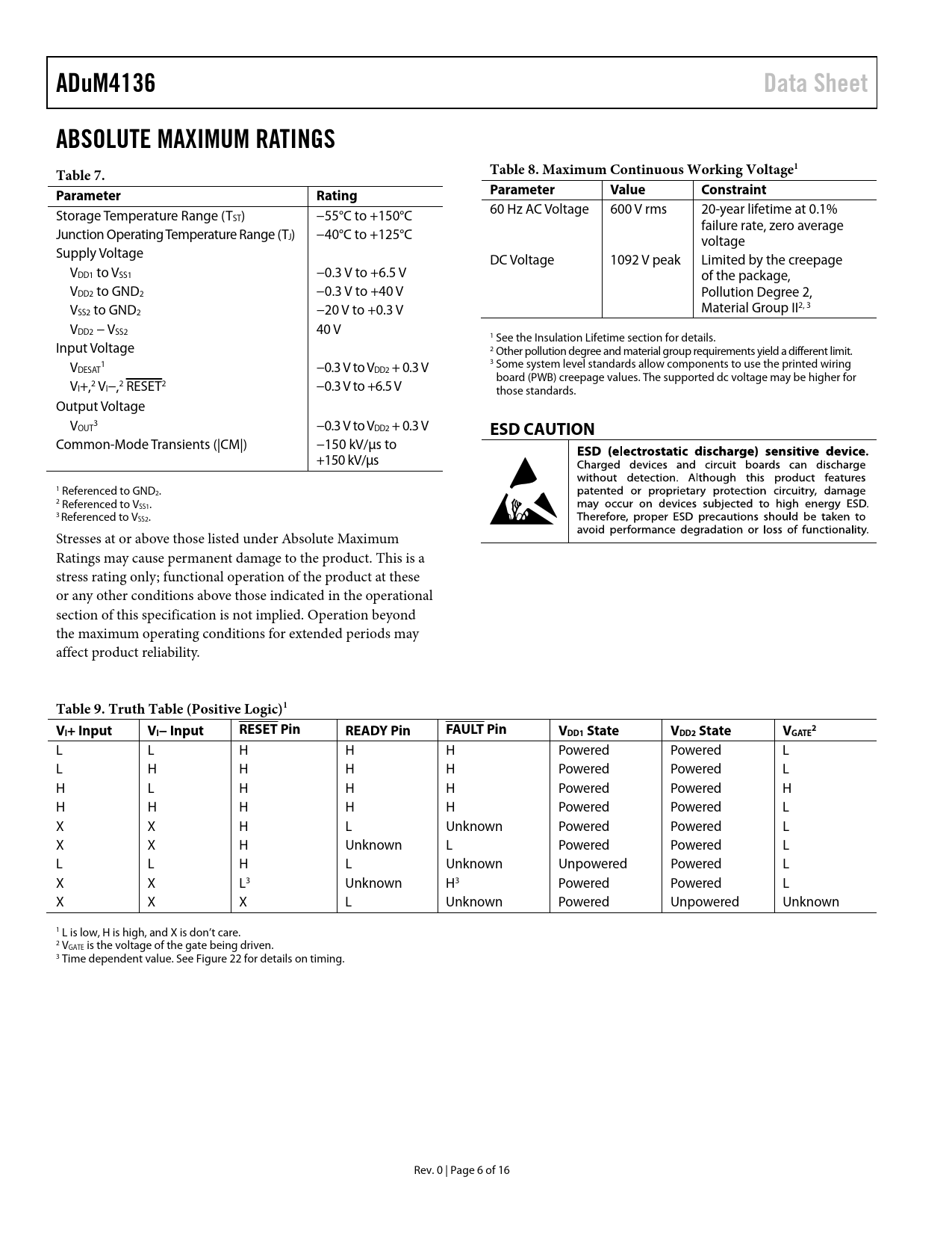 ADuM4136. Data Sheet. ABSOLUTE MAXIMUM RATINGS. Table 7. Table 8. Maximum Continuous Working Voltage1. Parameter. Rating