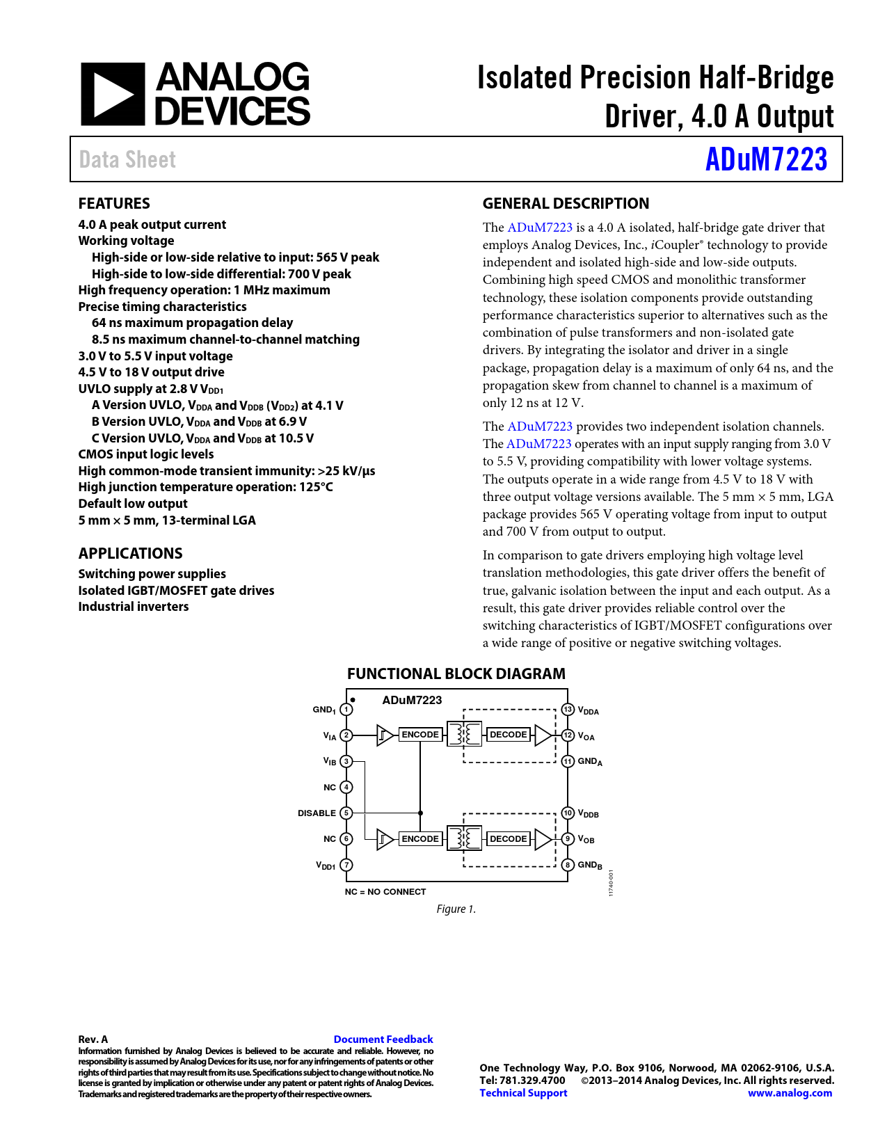 Isolated Precision Half-Bridge. Driver, 4.0 A Output. Data Sheet. ADuM7223. FEATURES. GENERAL DESCRIPTION