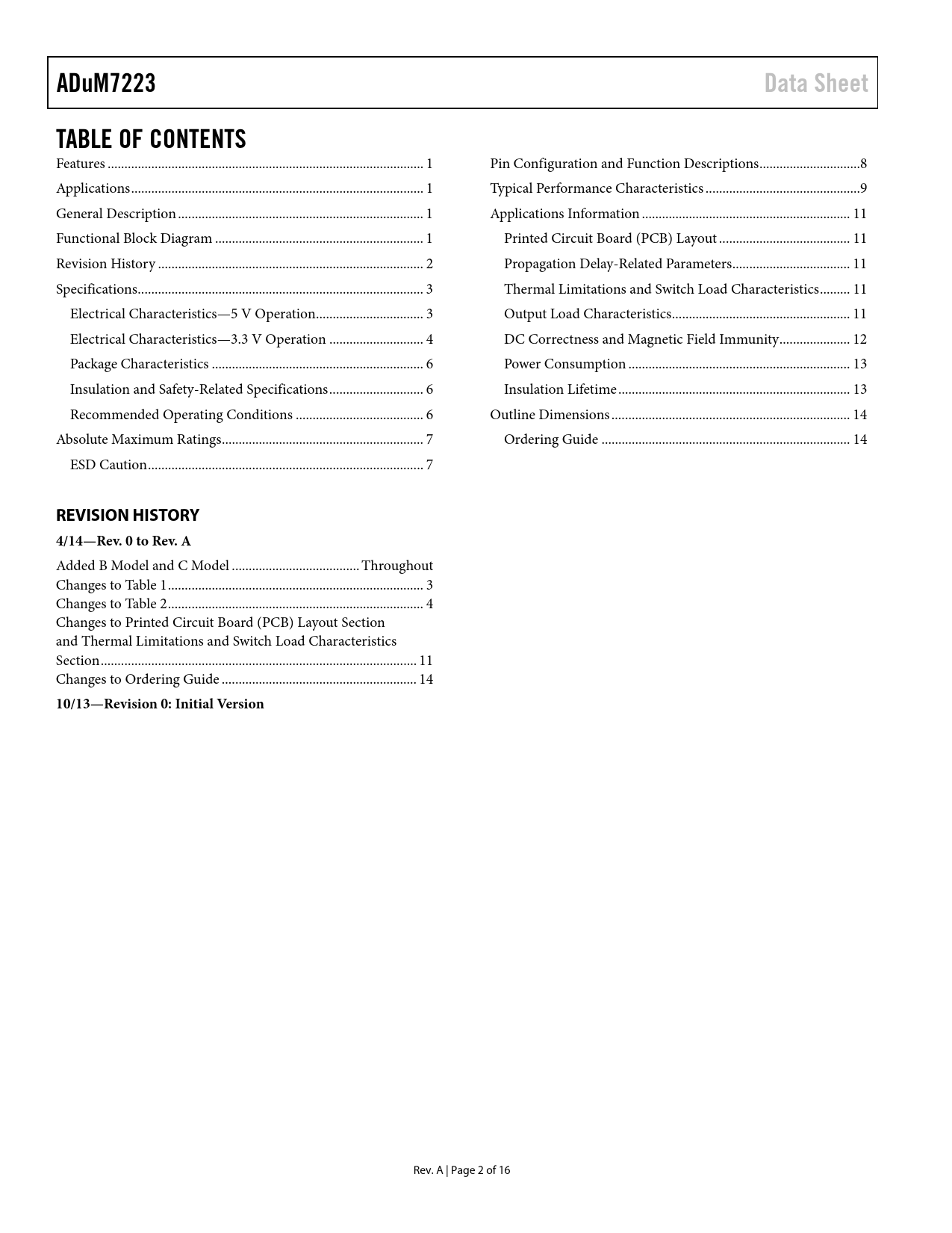 link to page 1 link to page 1 link to page 1 link to page 1 link to page 2 link to page 3 link to page 3 link to page 4 link to page 6 link to page 6 link to page 6 link to page 7 link to page 7 link to page 8 link to page 9 link to page 11 link to page 11 link to page 11 link to page 11 link to page 11 link to page 12 link to page 13 link to page 13 link to page 14 link to page 14 ADuM7223Data SheetTABLE OF CONTENTS Features .. 1 Pin Configuration and Function Descriptions ..8 Applications ... 1 Typical Performance Characteristics ..9 General Description ... 1 Applications Information .. 11 Functional Block Diagram .. 1 Printed Circuit Board (PCB) Layout ... 11 Revision History ... 2 Propagation Delay-Related Parameters ... 11 Specifications ... 3 Thermal Limitations and Switch Load Characteristics ... 11 Electrical Characteristics—5 V Operation.. 3 Output Load Characteristics ... 11 Electrical Characteristics—3.3 V Operation .. 4 DC Correctness and Magnetic Field Immunity ... 12 Package Characteristics ... 6 Power Consumption .. 13 Insulation and Safety-Related Specifications .. 6 Insulation Lifetime ... 13 Recommended Operating Conditions .. 6 Outline Dimensions ... 14 Absolute Maximum Ratings .. 7 Ordering Guide .. 14 ESD Caution .. 7 REVISION HISTORY 4/14—Rev. 0 to Rev. A Added B Model and C Model .. Throughout Changes to Table 1 .. 3 Changes to Table 2 .. 4 Changes to Printed Circuit Board (PCB) Layout Section and Thermal Limitations and Switch Load Characteristics Section .. 11 Changes to Ordering Guide .. 14 10/13—Revision 0: Initial Version Rev. A | Page 2 of 16 Document Outline Features Applications General Description Functional Block Diagram Table of Contents Revision History Specifications Electrical Characteristics—5 V Operation Electrical Characteristics—3.3 V Operation Package Characteristics Insulation and Safety-Related Specifications Recommended Operating Conditions Absolute Maximum Ratings ESD Caution Pin Configuration and Function Description Typical Performance Characteristics Applications Information Printed Circuit Board (PCB) Layout Propagation Delay-Related Parameters Thermal Limitations and Switch Load Characteristics Output Load Characteristics DC Correctness and Magnetic Field Immunity Power Consumption Insulation Lifetime Outline Dimension Ordering Guide
