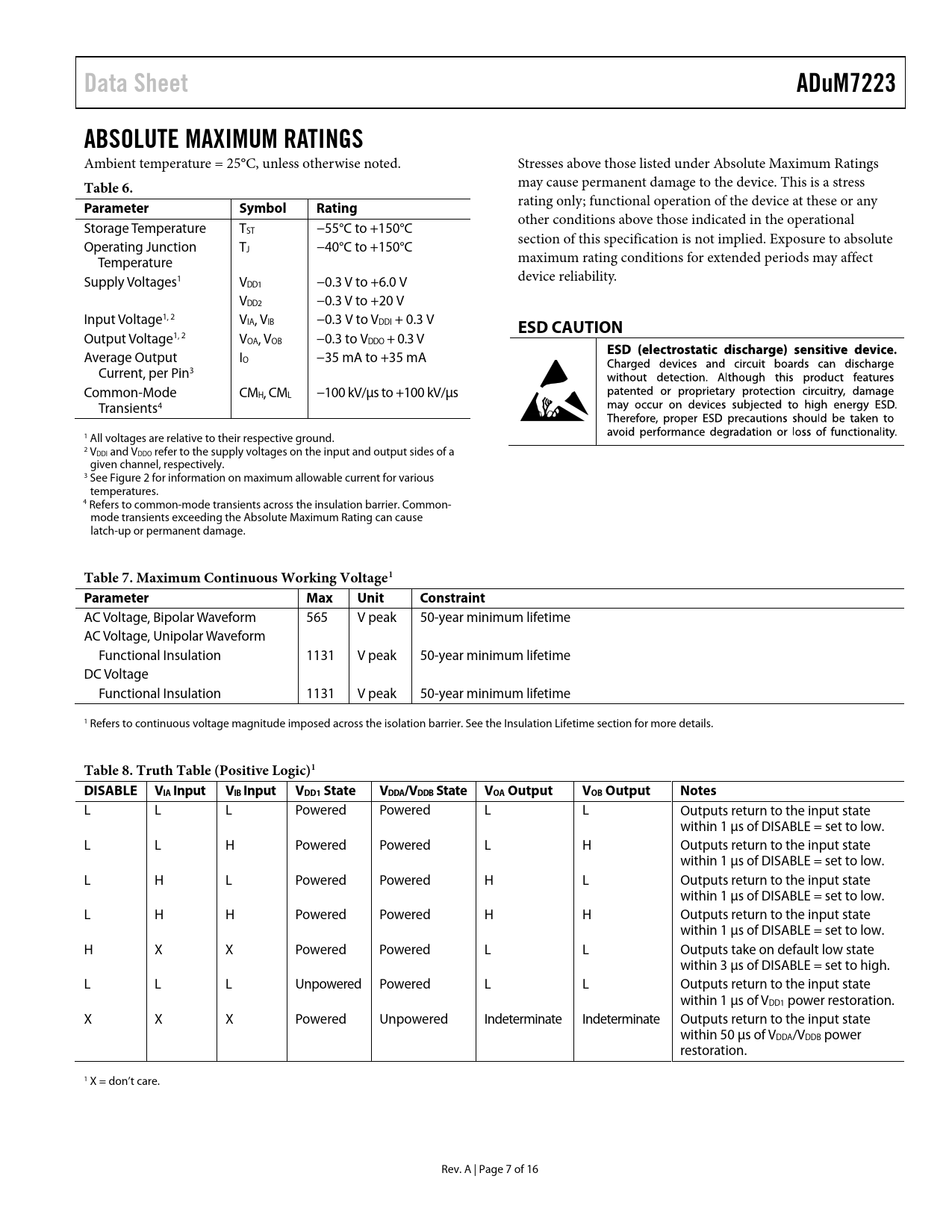 link to page 6 link to page 13 link to page 7 link to page 7 link to page 7 link to page 7 link to page 7 link to page 7 link to page 7 link to page 7 link to page 7 Data SheetADuM7223ABSOLUTE MAXIMUM RATINGS Ambient temperature = 25°C, unless otherwise noted. Stresses above those listed under Absolute Maximum Ratings Table 6. may cause permanent damage to the device. This is a stress ParameterSymbolRating rating only; functional operation of the device at these or any other conditions above those indicated in the operational Storage Temperature TST −55°C to +150°C section of this specification is not implied. Exposure to absolute Operating Junction TJ −40°C to +150°C Temperature maximum rating conditions for extended periods may affect Supply Voltages1 V device reliability. DD1 −0.3 V to +6.0 V VDD2 −0.3 V to +20 V Input Voltage1, 2 VIA, VIB −0.3 V to VDDI + 0.3 V ESD CAUTION Output Voltage1, 2 VOA, VOB −0.3 to VDDO + 0.3 V Average Output IO −35 mA to +35 mA Current, per Pin3 Common-Mode CMH, CML −100 kV/µs to +100 kV/µs Transients4 1 All voltages are relative to their respective ground. 2 VDDI and VDDO refer to the supply voltages on the input and output sides of a given channel, respectively. 3 See Figure 2 for information on maximum allowable current for various temperatures. 4 Refers to common-mode transients across the insulation barrier. Common- mode transients exceeding the Absolute Maximum Rating can cause latch-up or permanent damage. Table 7. Maximum Continuous Working Voltage1ParameterMaxUnitConstraint AC Voltage, Bipolar Waveform 565 V peak 50-year minimum lifetime AC Voltage, Unipolar Waveform Functional Insulation 1131 V peak 50-year minimum lifetime DC Voltage Functional Insulation 1131 V peak 50-year minimum lifetime 1 Refers to continuous voltage magnitude imposed across the isolation barrier. See the Insulation Lifetime section for more details. Table 8. Truth Table (Positive Logic)1DISABLE VIA InputVIB InputVDD1 StateVDDA/VDDB State VOA OutputVOB OutputNotes L L L Powered Powered L L Outputs return to the input state within 1 µs of DISABLE = set to low. L L H Powered Powered L H Outputs return to the input state within 1 µs of DISABLE = set to low. L H L Powered Powered H L Outputs return to the input state within 1 µs of DISABLE = set to low. L H H Powered Powered H H Outputs return to the input state within 1 µs of DISABLE = set to low. H X X Powered Powered L L Outputs take on default low state within 3 µs of DISABLE = set to high. L L L Unpowered Powered L L Outputs return to the input state within 1 µs of VDD1 power restoration. X X X Powered Unpowered Indeterminate Indeterminate Outputs return to the input state within 50 µs of VDDA/VDDB power restoration. 1 X = don’t care. Rev. A | Page 7 of 16 Document Outline Features Applications General Description Functional Block Diagram Table of Contents Revision History Specifications Electrical Characteristics—5 V Operation Electrical Characteristics—3.3 V Operation Package Characteristics Insulation and Safety-Related Specifications Recommended Operating Conditions Absolute Maximum Ratings ESD Caution Pin Configuration and Function Description Typical Performance Characteristics Applications Information Printed Circuit Board (PCB) Layout Propagation Delay-Related Parameters Thermal Limitations and Switch Load Characteristics Output Load Characteristics DC Correctness and Magnetic Field Immunity Power Consumption Insulation Lifetime Outline Dimension Ordering Guide