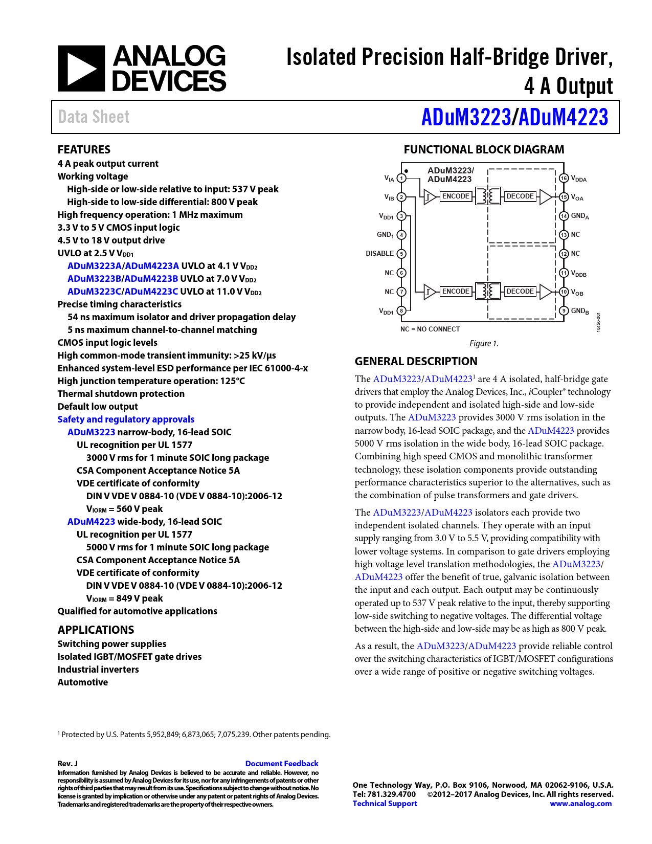 Isolated Precision Half-Bridge Driver,. 4 A Output. Data Sheet. ADuM3223/. ADuM4223. FEATURES. FUNCTIONAL BLOCK DIAGRAM