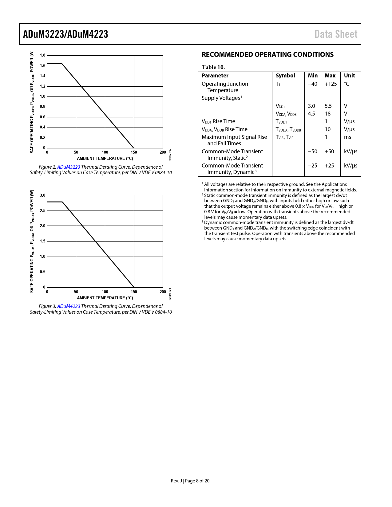 Immunity, Static2 10450- Figure 2. ADuM3223 Thermal Derating Curve, Dependence of Common-Mode Transient −25 +25 kV/µs Safety-Limiting Values on Case Temperature, per DIN V VDE V 0884-10 Immunity, Dynamic3 1 All voltages are relative to their respective ground. See the Applications