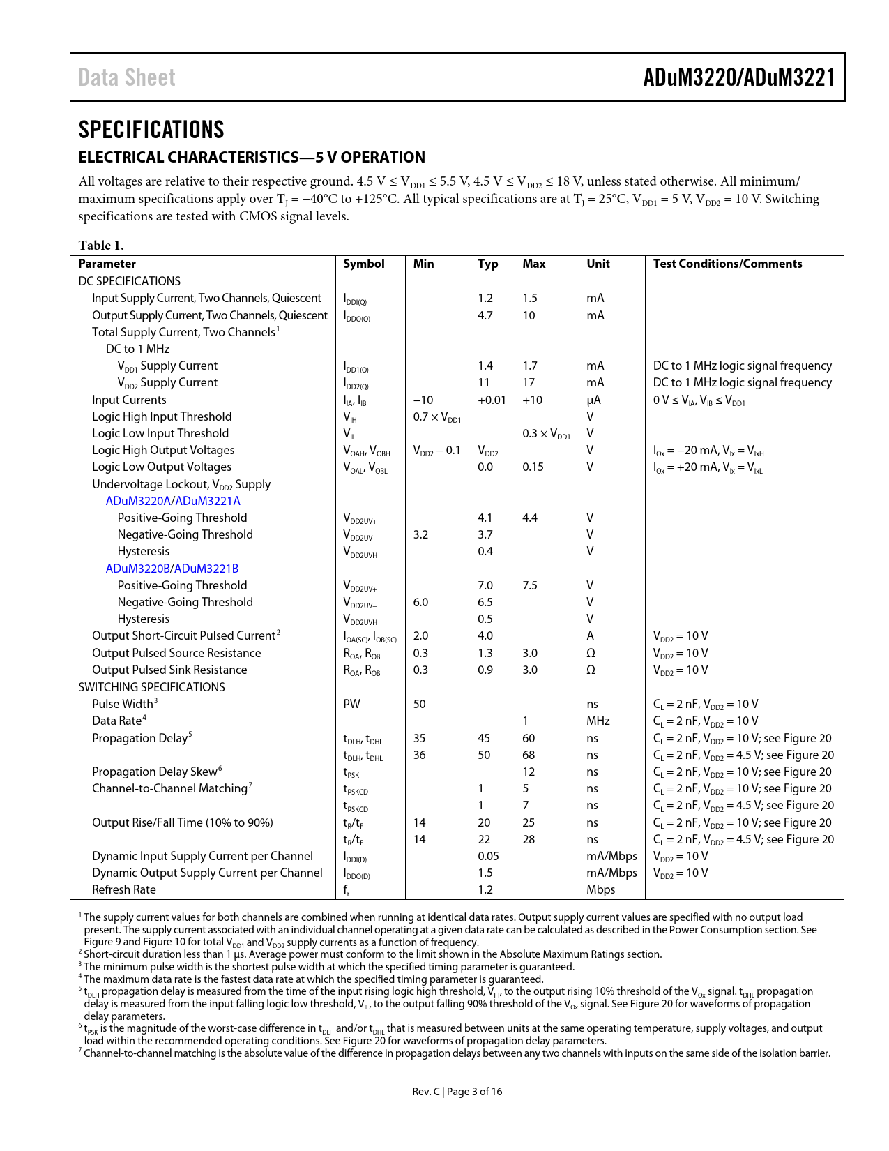 Data Sheet. ADuM3220/ADuM3221. SPECIFICATIONS ELECTRICAL CHARACTERISTICS—5 V OPERATION. Table 1. Parameter. Symbol. Min. Typ. Max. Unit