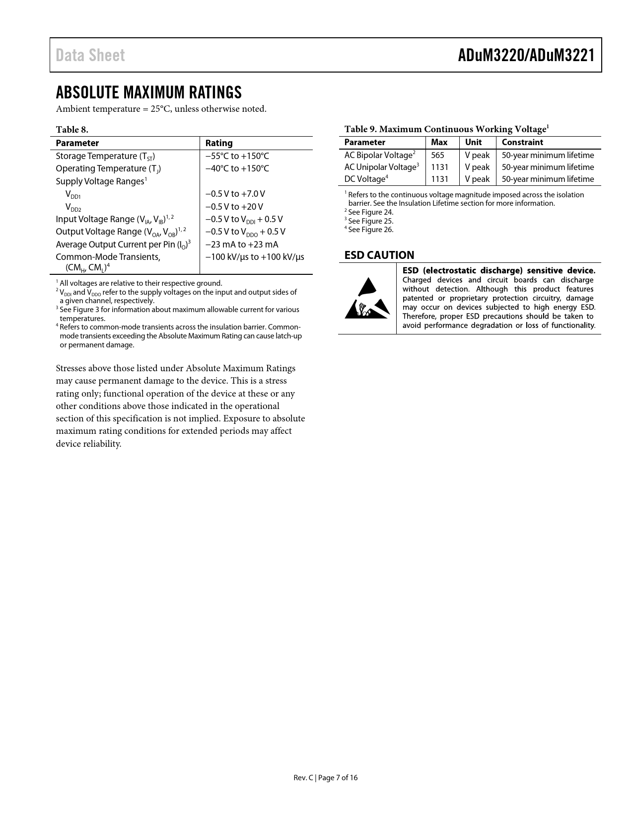 Data Sheet ADuM3220/ADuM3221 ABSOLUTE MAXIMUM RATINGS Table 8 Table 9 Maximum Continuous Working Voltage1 Parameter Rating