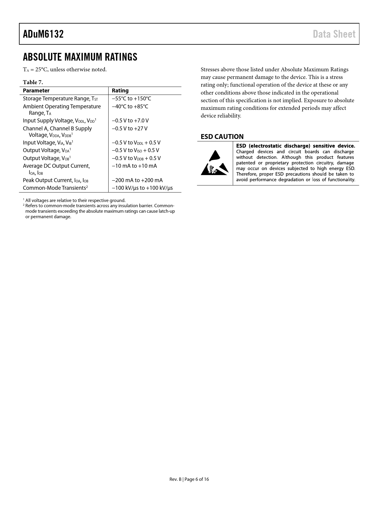 link to page 6 link to page 6 link to page 6 link to page 6 link to page 6 link to page 6 ADuM6132Data SheetABSOLUTE MAXIMUM RATINGS TA = 25°C, unless otherwise noted. Stresses above those listed under Absolute Maximum Ratings may cause permanent damage to the device. This is a stress Table 7. rating only; functional operation of the device at these or any ParameterRating other conditions above those indicated in the operational Storage Temperature Range, TST −55°C to +150°C section of this specification is not implied. Exposure to absolute Ambient Operating Temperature −40°C to +85°C maximum rating conditions for extended periods may affect Range, TA device reliability. Input Supply Voltage, V 1 DDL, VDD −0.5 V to +7.0 V Channel A, Channel B Supply −0.5 V to +27 V Voltage, V 1 DDA, VDDB ESD CAUTION Input Voltage, V 1 IA, VIB −0.5 V to VDDL + 0.5 V Output Voltage, V 1 OA −0.5 V to VISO + 0.5 V Output Voltage, V 1 OB −0.5 V to VDDB + 0.5 V Average DC Output Current, −10 mA to +10 mA IOA, IOB Peak Output Current, IOA, IOB −200 mA to +200 mA Common-Mode Transients2 −100 kV/µs to +100 kV/µs 1 All voltages are relative to their respective ground. 2 Refers to common-mode transients across any insulation barrier. Common- mode transients exceeding the absolute maximum ratings can cause latch-up or permanent damage. Rev. B | Page 6 of 16 Document Outline Features Applications General Description Functional Block Diagram Table of Contents Revision History Specifications Electrical Characteristics Package Characteristics Regulatory Information Insulation and Safety-Related Specifications DIN V VDE V 0884-10 (VDE V 0884-10) Insulation Characteristics Recommended Operation Conditions Absolute Maximum Values ESD Caution Pin Configuration and Function Descriptions Typical Performance Characteristics Terminology Applications Information Typical Application Usage PCB Layout Thermal Analysis Undervoltage Lockout Propagation Delay-Related Parameters Magnetic Field Immunity Insulation Lifetime Outline Dimensions Ordering Guide