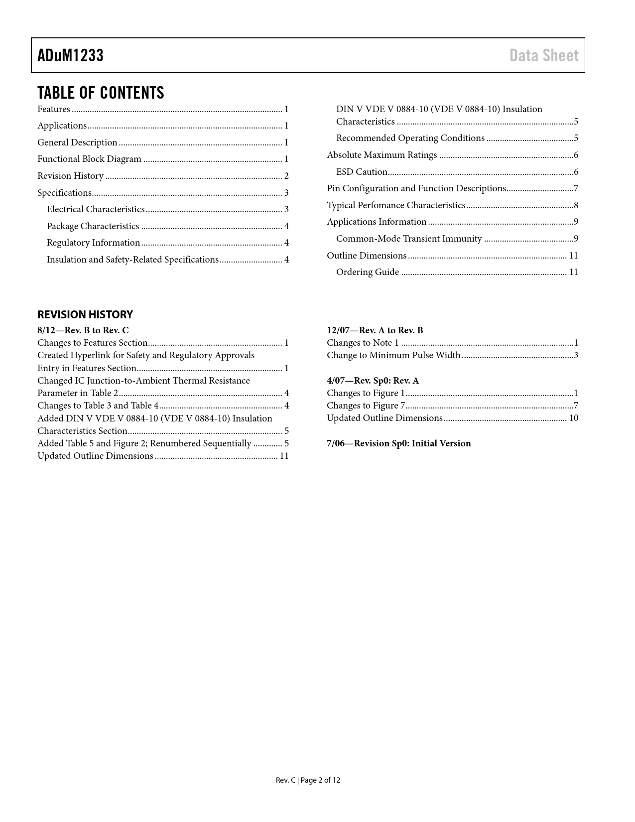 ADuM1233. Data Sheet. TABLE OF CONTENTS. REVISION HISTORY 8/12—Rev. B to Rev. C. 12/07—Rev. A to Rev. B. 4/07—Rev. Sp0: Rev. A