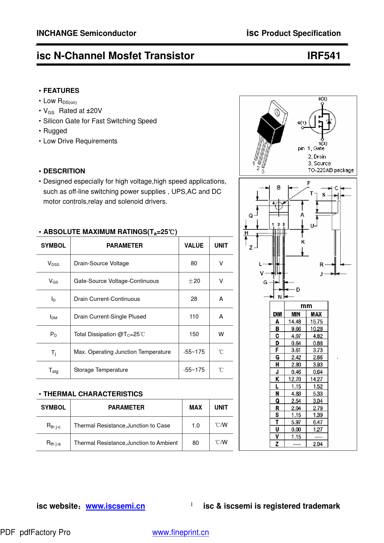 INCHANGE Semiconductor. isc Product Specification. isc N-Channel Mosfet Transistor IRF541. ·FEATURES. ·DESCRITION