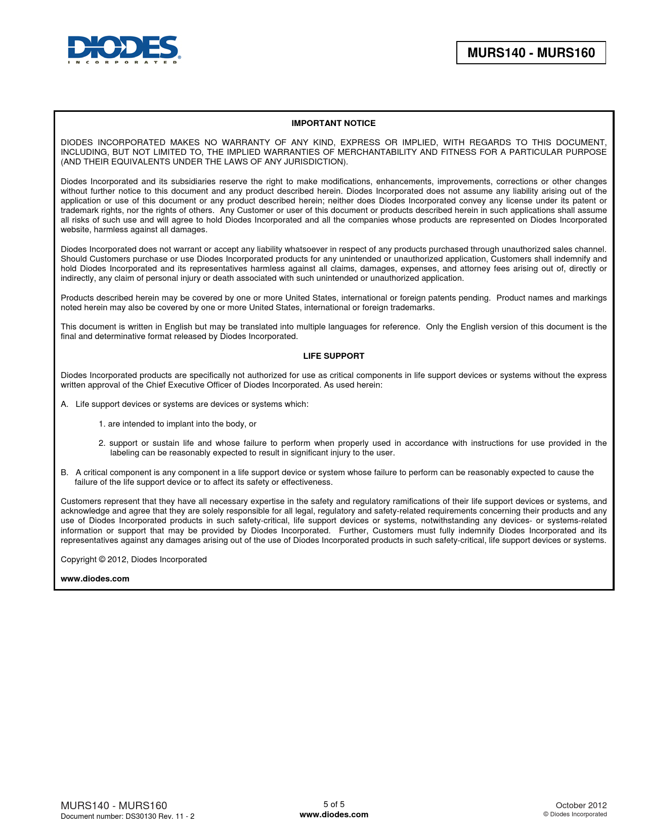 | Páginas / Página | 5 / 5 — MURS140 - MURS160. IMPORTANT NOTICE. LIFE SUPPORT. www.diodes.com |