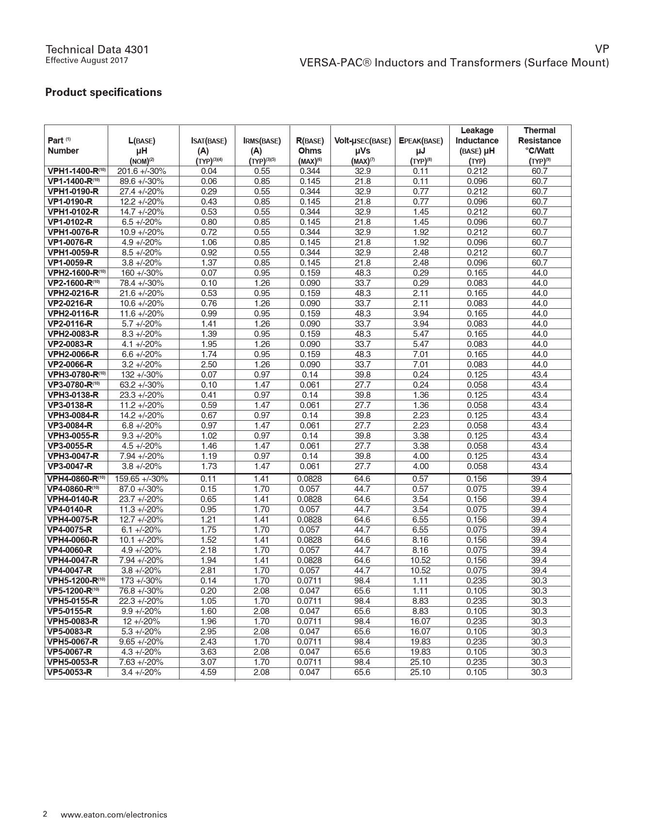 Technical Data 4301 VP Effective August 2017 VERSA-PAC® Inductors and Transformers (Surface Mount)
