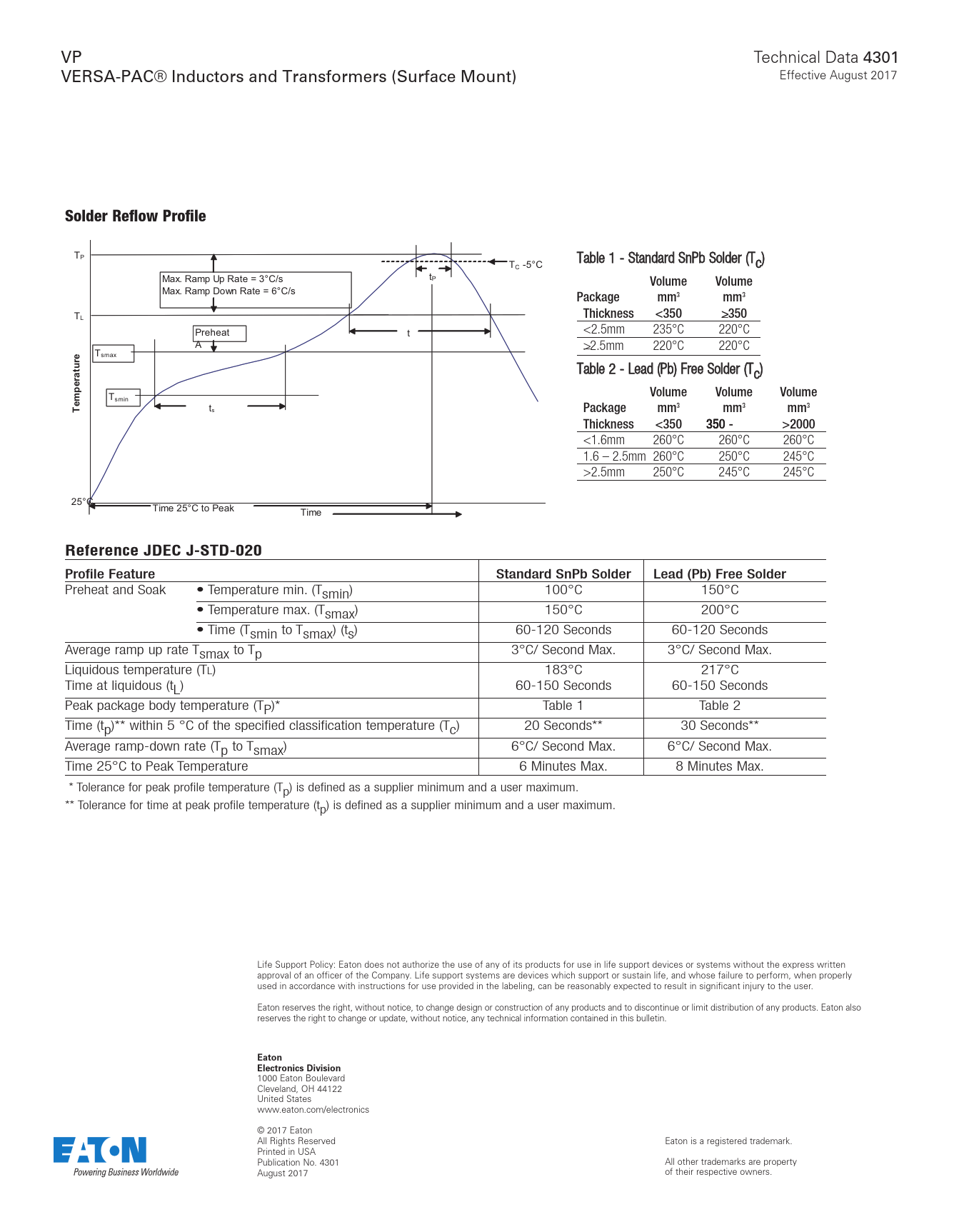 Profile Feature Standard SnPb Solder Lead (Pb) Free Solder Preheat and Soak • e T mperature min. (Tsmin) 100°C 150°C • Temperature max. (Tsmax) 150°C 200°C • Time (Tsmin to Tsmax) (ts) 60-120 Seconds 60-120 Seconds Average ramp up rate T 3°C/ Second Max. 3°C/ Second Max. smax to Tp Liquidous temperature (TL) 183°C 217°C Time at liquidous (t 60-150 Seconds 60-150 Seconds L) Peak package body temperature (T Table 1 ab T le 2 P)* Time (t 20 Seconds** 30 Seconds** p)** within 5 °C of the specified classification temperature (Tc) Average ramp-down rate (T 6°C/ Second Max. 6°C/ Second Max. p to Tsmax) Time 25°C to Peak Temperature Minut 6 es Max. 8 Minutes Max. * Tolerance for peak profile temperature (Tp) is defined as a supplier minimum and a user maximum. ** Tolerance for time at peak profile temperature (tp) is defined as a supplier minimum and a user maximum. Life Support Policy: Eaton does not authorize the use of any of its products for use in life support devices or systems without the express written approval of an officer of the Company. Life support systems are devices which support or sustain life, and whose failure to perform, when properly used in accordance with instructions for use provided in the labeling, can be reasonably expected to result in significant injury to the user. Eaton reserves the right, without notice, to change design or construction of any products and to discontinue or limit distribution of any products. Eaton also reserves the right to change or update, without notice, any technical information contained in this bulletin.
