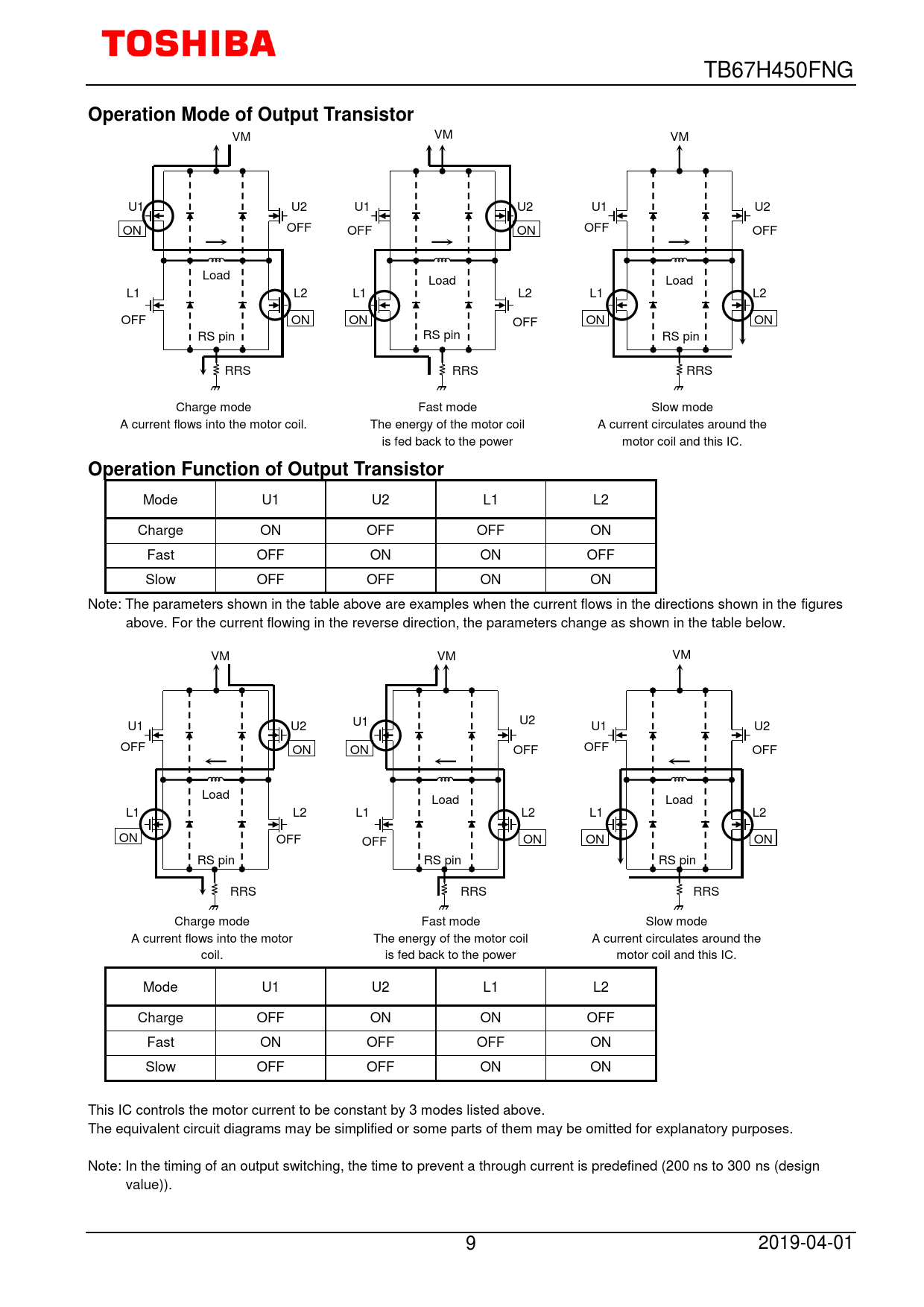 Mode U1 U2 L1 L2 Charge ON OFF OFF ON Fast OFF ON ON OFF Slow OFF OFF ON ON Note: The parameters shown in the table above are examples when the current flows in the directions shown in the figures above. For the current flowing in the reverse direction, the parameters change as shown in the table below. VM VM VM U1 U2 U1 U2 U1 U2 OFF ON ON OFF OFF OFF Load Load Load L1 L2 L1 L2 L1 L2 ON OFF OFF ON ON ON RS pin RS pin RS pin RRS RRS RRS Charge mode Fast mode Slow mode A current flows into the motor The energy of the motor coil A current circulates around the coil. is fed back to the power motor coil and this IC. Mode U1 U2 L1 L2 Charge OFF ON ON OFF Fast ON OFF OFF ON Slow OFF OFF ON ON This IC controls the motor current to be constant by 3 modes listed above. The equivalent circuit diagrams may be simplified or some parts of them may be omitted for explanatory purposes. Note: In the timing of an output switching, the time to prevent a through current is predefined (200 ns to 300 ns (design value)). 9 2019-04-01