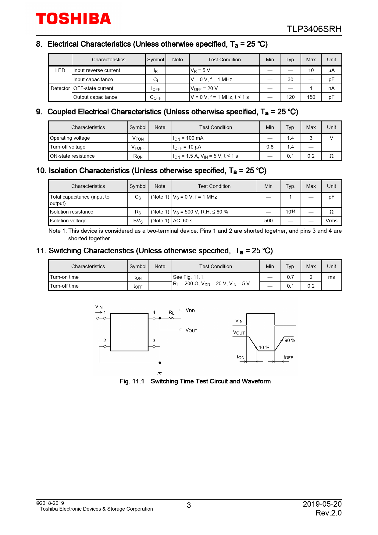 TLP3406SRH 8. Electrical Characteristics (Unless otherwise specified, Ta = 25 ) Characteristics Symbol Note Test Condition Min Typ. Max Unit LED Input reverse current IR VR = 5 V 10 µA Input capacitance Ct V = 0 V, f = 1 MHz 30 pF Detector OFF-state current IOFF VOFF = 20 V 1 nA Output capacitance COFF V = 0 V, f = 1 MHz, t < 1 s 120 150 pF 9. Coupled Electrical Characteristics (Unless otherwise specified, Ta = 25 ) Characteristics Symbol Note Test Condition Min Typ. Max Unit Operating voltage VFON ION = 100 mA 1.4 3 V Turn-off voltage VFOFF IOFF = 10 µA 0.8 1.4 ON-state resistance RON ION = 1.5 A, VIN = 5 V, t < 1 s 0.1 0.2 Ω 10. Isolation Characteristics (Unless otherwise specified, Ta = 25 ) Characteristics Symbol Note Test Condition Min Typ. Max Unit Total capacitance (input to CS (Note 1) VS = 0 V, f = 1 MHz 1 pF output) Isolation resistance RS (Note 1) VS = 500 V, R.H. ≤ 60 % 1014 Ω Isolation voltage BVS (Note 1) AC, 60 s 500 Vrms Note 1: This device is considered as a two-terminal device: Pins 1 and 2 are shorted together, and pins 3 and 4 are shorted together. 11. Switching Characteristics (Unless otherwise specified, Ta = 25 ) Characteristics Symbol Note Test Condition Min Typ. Max Unit Turn-on time tON See Fig. 11.1. 0.7 2 ms Turn-off time t RL = 200 Ω, VDD = 20 V, VIN = 5 V OFF 0.1 0.2 Fig. 11.1 Switching Time Test Circuit and Waveform ©2018-2019 3 2019-05-20 Toshiba Electronic Devices & Storage Corporation Rev.2.0