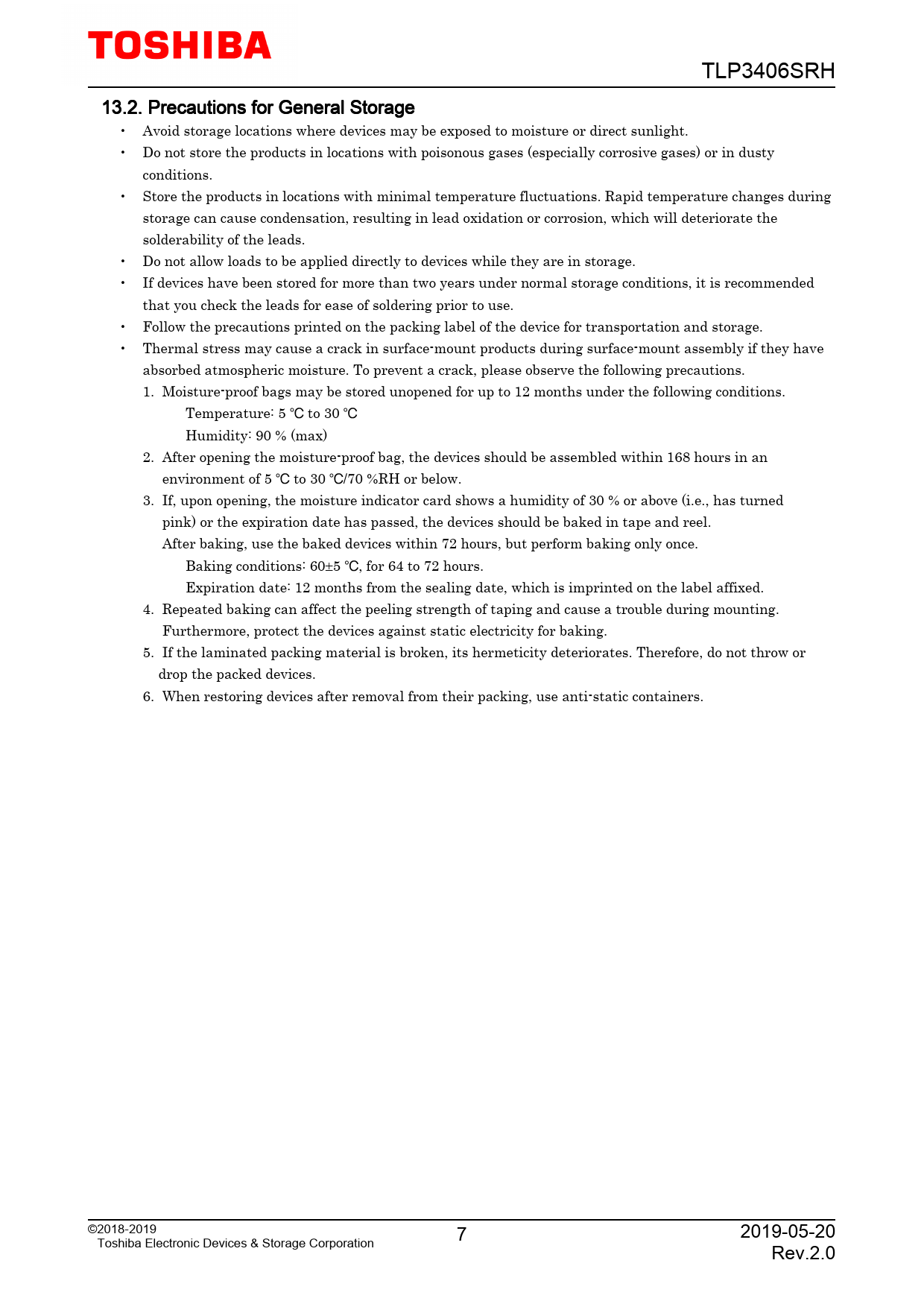 TLP3406SRH. 13.2. Precautions. for. General. Storage. •. Avoid. storage. locations. where. devices. may. be. exposed. to. moisture. or. direct. sunlight. •. Do