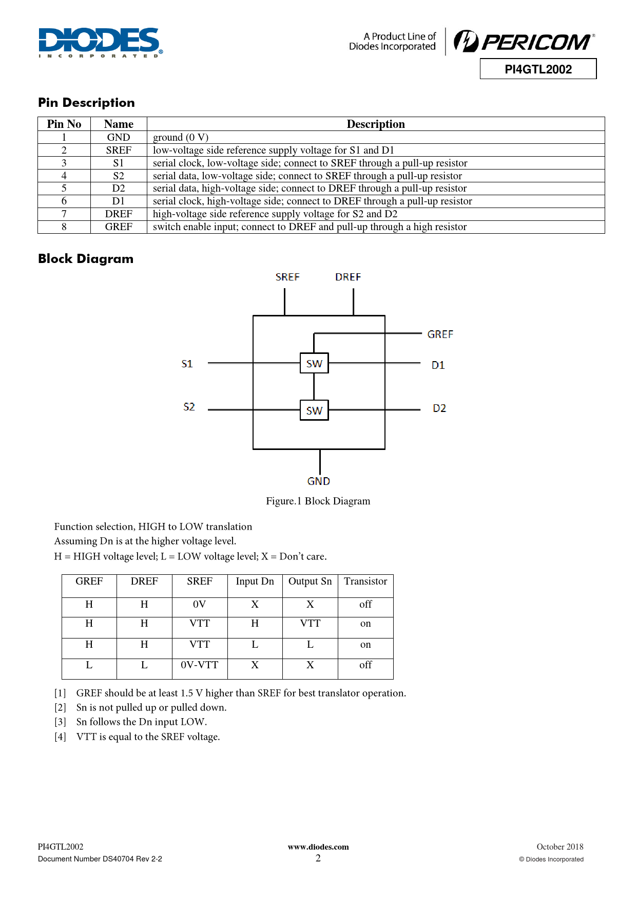 PI4GTL2002. Pin Description. Pin No. Name. Description. Block Diagram. www.diodes.com