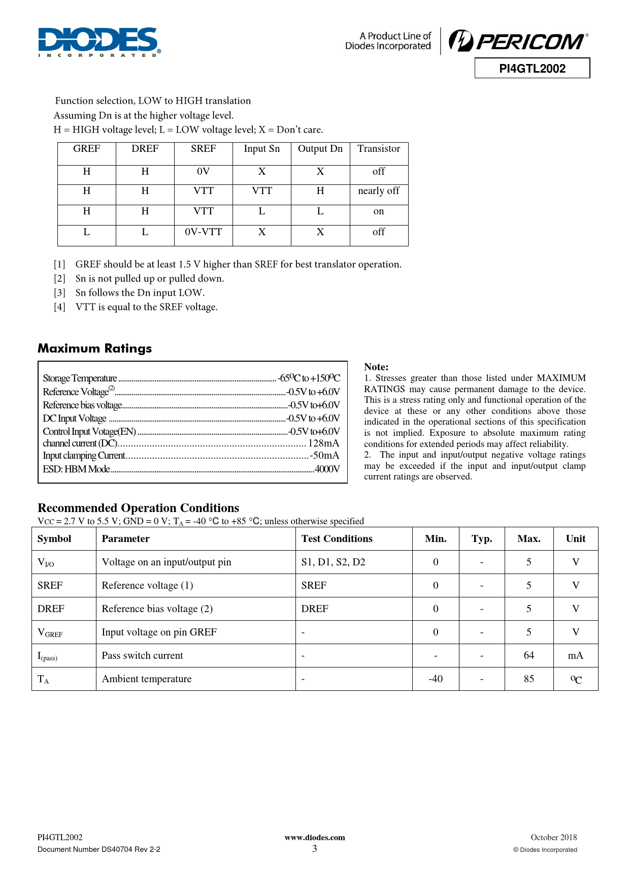 PI4GTL2002. Maximum Ratings. Note:. Recommended Operation Conditions. Symbol. Parameter. Test Conditions. Min. Typ. Max. Unit. www.diodes.com