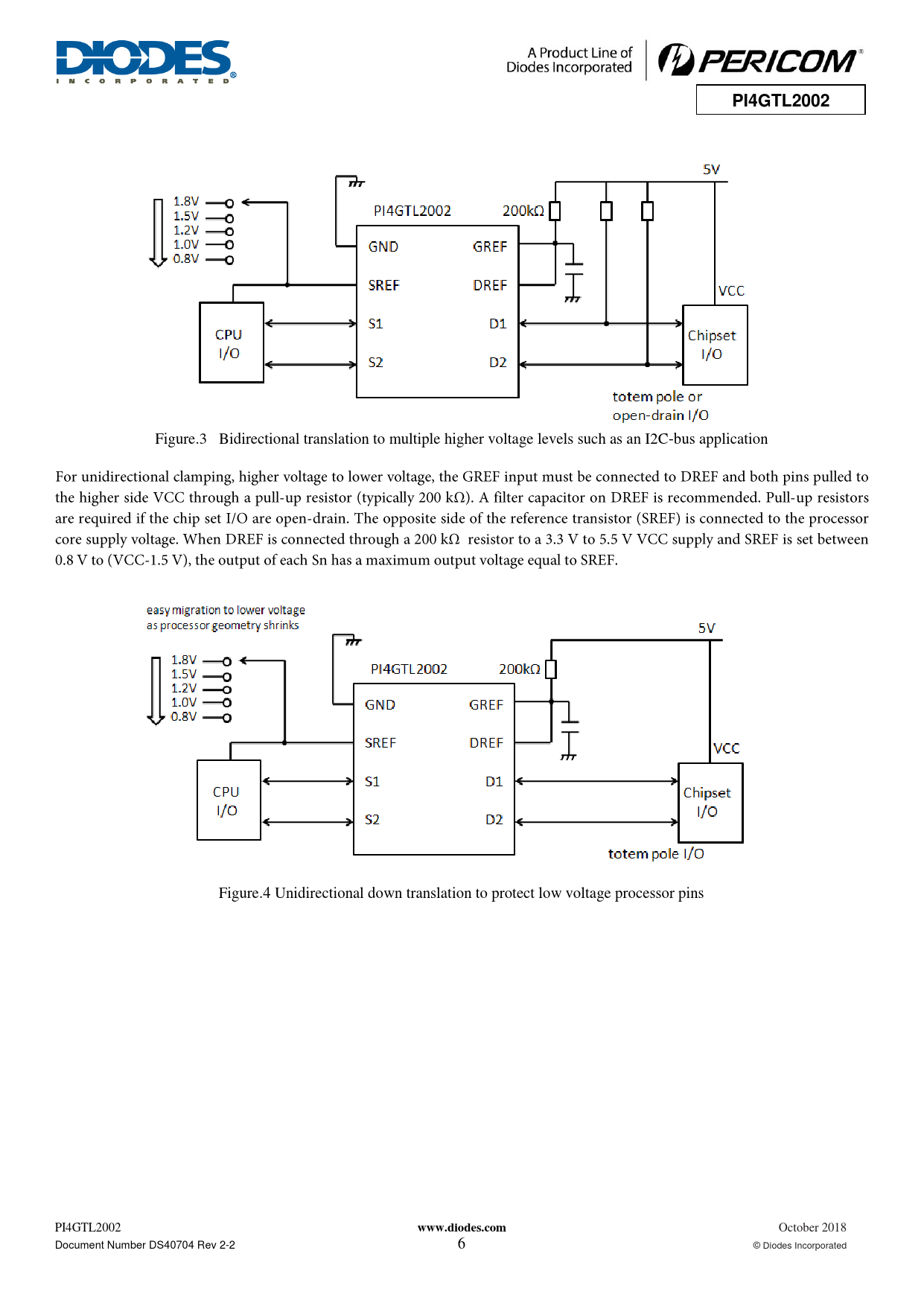 Figure.3 Bidirectional translation to multiple higher voltage levels such as an I2C-bus application Figure.4 Unidirectional down translation to protect low voltage processor pins PI4GTL2002
