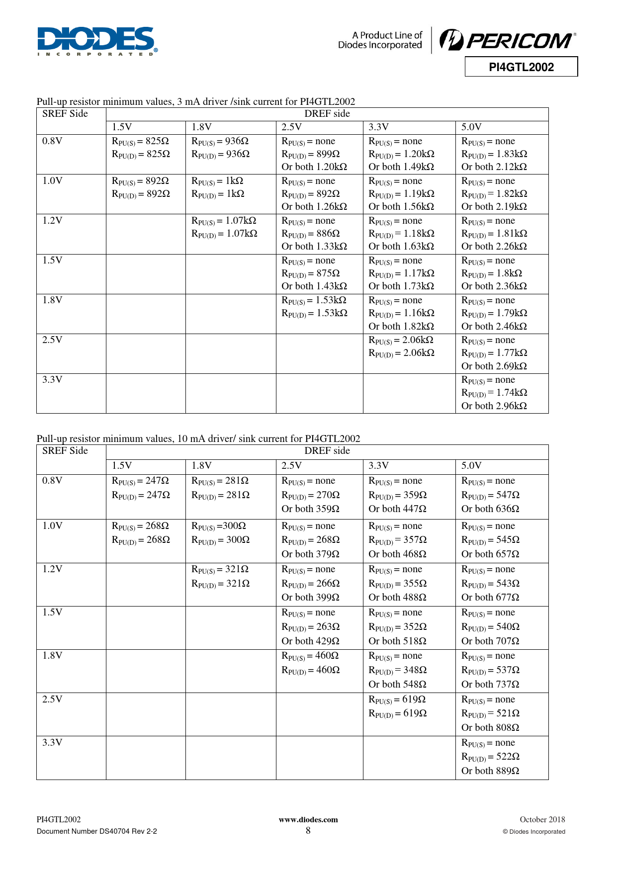 Pull-up resistor minimum values, 3 mA driver /sink current for PI4GTL2002 SREF Side DREF side 1.5V 1.8V 2.5V 3.3V 5.0V 0.8V RPU(S) = 825Ω RPU(S) = 936Ω RPU(S) = none RPU(S) = none RPU(S) = none RPU(D) = 825Ω RPU(D) = 936Ω RPU(D) = 899Ω RPU(D) = 1.20kΩ RPU(D) = 1.83kΩ Or both 1.20kΩ Or both 1.49kΩ Or both 2.12kΩ 1.0V RPU(S) = 892Ω RPU(S) = 1kΩ RPU(S) = none RPU(S) = none RPU(S) = none R = 1.82kΩ PU(D) = 892Ω RPU(D) = 1kΩ RPU(D) = 892Ω RPU(D) = 1.19kΩ RPU(D) Or both 1.26kΩ Or both 1.56kΩ Or both 2.19kΩ 1.2V RPU(S) = 1.07kΩ RPU(S) = none RPU(S) = none RPU(S) = none R = 1.18kΩ PU(D) = 1.07kΩ RPU(D) = 886Ω RPU(D) RPU(D) = 1.81kΩ Or both 1.33kΩ Or both 1.63kΩ Or both 2.26kΩ 1.5V RPU(S) = none RPU(S) = none RPU(S) = none RPU(D) = 875Ω RPU(D) = 1.17kΩ RPU(D) = 1.8kΩ Or both 1.43kΩ Or both 1.73kΩ Or both 2.36kΩ 1.8V RPU(S) = 1.53kΩ RPU(S) = none RPU(S) = none RPU(D) = 1.53kΩ RPU(D) = 1.16kΩ RPU(D) = 1.79kΩ Or both 1.82kΩ Or both 2.46kΩ 2.5V RPU(S) = 2.06kΩ RPU(S) = none RPU(D) = 2.06kΩ RPU(D) = 1.77kΩ Or both 2.69kΩ 3.3V RPU(S) = none R = 1.74kΩ PU(D) Or both 2.96kΩ Pull-up resistor minimum values, 10 mA driver/ sink current for PI4GTL2002 SREF Side DREF side 1.5V 1.8V 2.5V 3.3V 5.0V 0.8V RPU(S) = 247Ω RPU(S) = 281Ω RPU(S) = none RPU(S) = none RPU(S) = none RPU(D) = 247Ω RPU(D) = 281Ω RPU(D) = 270Ω RPU(D) = 359Ω RPU(D) = 547Ω Or both 359Ω Or both 447Ω Or both 636Ω 1.0V RPU(S) = 268Ω RPU(S) =300Ω RPU(S) = none RPU(S) = none RPU(S) = none R = 357Ω PU(D) = 268Ω RPU(D) = 300Ω RPU(D) = 268Ω RPU(D) RPU(D) = 545Ω Or both 379Ω Or both 468Ω Or both 657Ω 1.2V RPU(S) = 321Ω RPU(S) = none RPU(S) = none RPU(S) = none RPU(D) = 321Ω RPU(D) = 266Ω RPU(D) = 355Ω RPU(D) = 543Ω Or both 399Ω Or both 488Ω Or both 677Ω 1.5V RPU(S) = none RPU(S) = none RPU(S) = none RPU(D) = 263Ω RPU(D) = 352Ω RPU(D) = 540Ω Or both 429Ω Or both 518Ω Or both 707Ω 1.8V RPU(S) = 460Ω RPU(S) = none RPU(S) = none R = 348Ω PU(D) = 460Ω RPU(D) RPU(D) = 537Ω Or both 548Ω Or both 737Ω 2.5V RPU(S) = 619Ω RPU(S) = none R = 521Ω PU(D) = 619Ω RPU(D) Or both 808Ω 3.3V RPU(S) = none RPU(D) = 522Ω Or both 889Ω PI4GTL2002