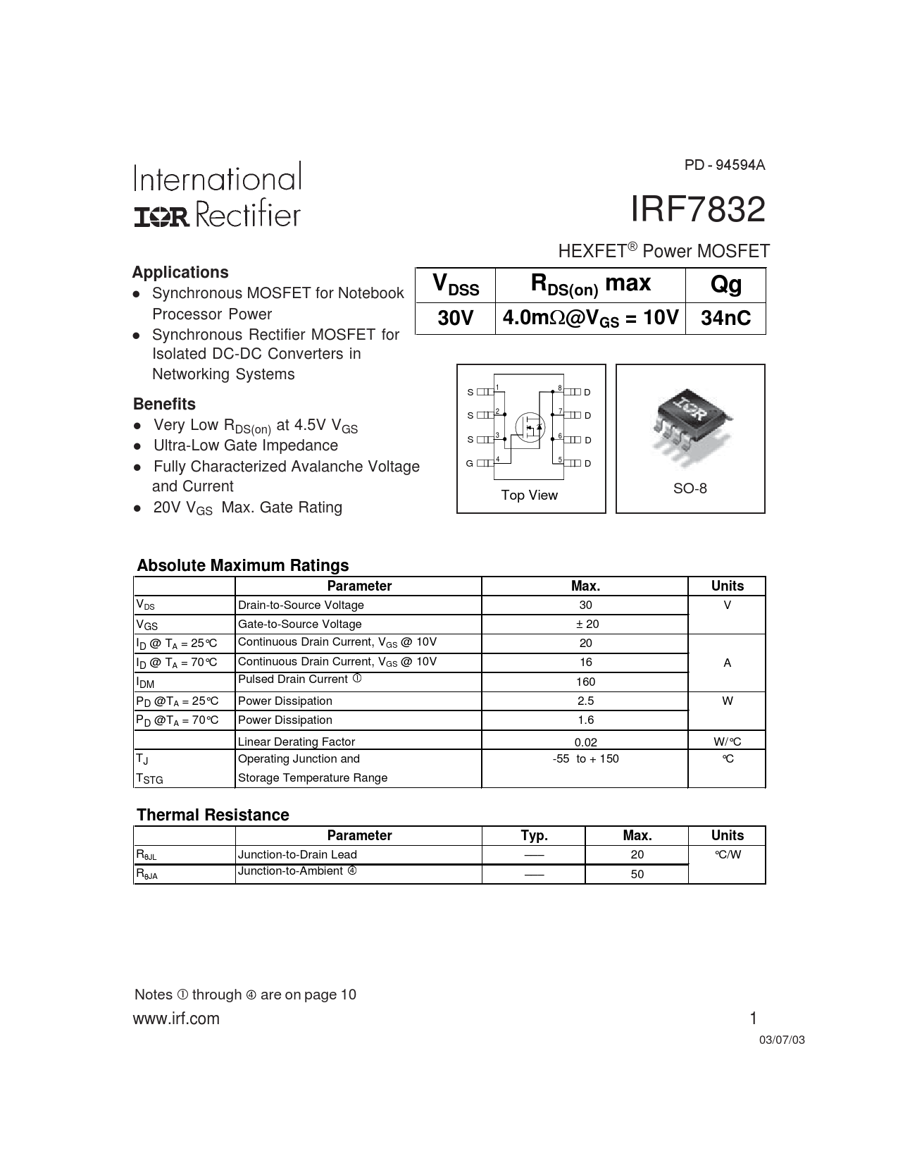 PD - 94594A IRF7832 HEXFET® Power MOSFET