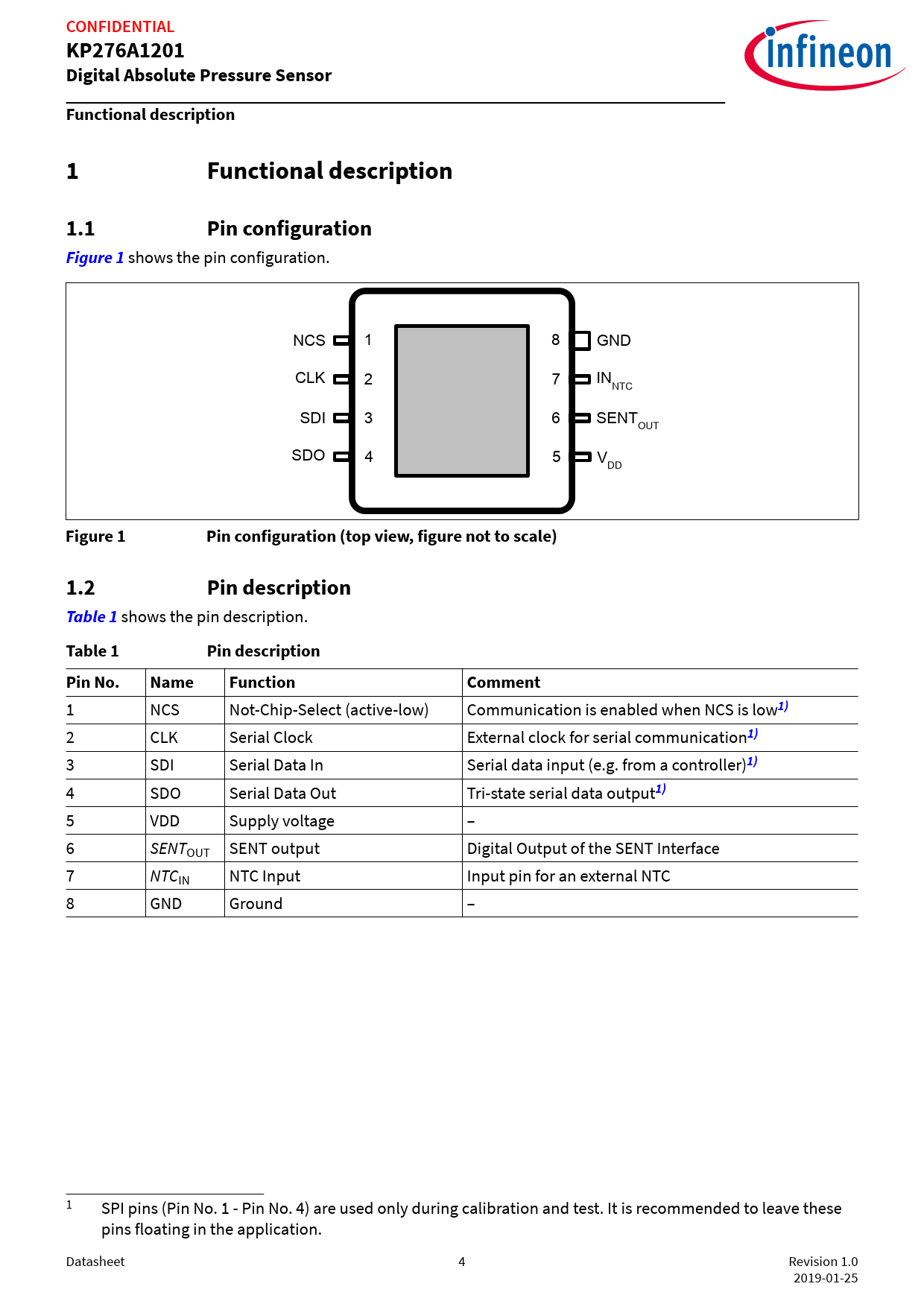 link to page 4 link to page 4 link to page 4 link to page 4 link to page 4 link to page 4 CONFIDENTIALKP276A1201Digital Absolute Pressure SensorFunctional description1Functional description1.1Pin configurationFigure 1 shows the pin configuration. NCS 1 8 GND CLK 2 7 INNTC SDI 3 6 SENTOUT SDO 4 5 VDD Figure 1Pin configuration (top view, figure not to scale)1.2Pin descriptionTable 1 shows the pin description. Table 1Pin descriptionPin No.NameFunctionComment 1 NCS Not-Chip-Select (active-low) Communication is enabled when NCS is low 1) 2 CLK Serial Clock External clock for serial communication 1) 3 SDI Serial Data In Serial data input (e.g. from a controller) 1) 4 SDO Serial Data Out Tri-state serial data output 1) 5 VDD Supply voltage – 6 SENTOUT SENT output Digital Output of the SENT Interface 7 NTCIN NTC Input Input pin for an external NTC 8 GND Ground – 1 SPI pins (Pin No. 1 - Pin No. 4) are used only during calibration and test. It is recommended to leave these pins floating in the application. Datasheet 4 Revision 1.0 2019-01-25 Document Outline dTurboTMAP with SENT Output and Temperature Sensor Interface Features Potential applications Product validation Description Table of contents 1 Functional description 1.1 Pin configuration 1.2 Pin description 1.3 Block Diagram 1.4 Transfer function pressure 1.4.1 Pressure transfer function characteristics 1.4.2 Pressure accuracy 1.5 Transfer function temperature 1.5.1 Temperature transfer function characteristics 1.6 SENT interface 1.6.1 Physical layer 1.6.2 Data link layer 1.6.2.1 Nibble specification 1.6.2.2 Status and communication nibble 1.6.2.3 Enhanced serial message format 1.6.2.4 Enhanced serial message data 1.6.3 Pressure channel output codes 1.6.4 Temperature channel output codes 1.6.5 Diagnostic Error Codes 1.6.5.1 Signal out of range 1.6.5.2 Diag1 1.6.5.3 Diag2 1.6.5.4 EEPROM Check 1.6.6 Definition of Pressure signal path latency 1.7 External temperature sensor 1.7.1 Linearization of the external temperature sensor transfer function 1.7.2 Accuracy for NTC signal processing 2 Specification 2.1 Application circuit example 2.2 Application circuit example for EMC 2.3 Absolute maximum ratings 2.4 Operating range 2.5 Characteristics 3 Package information 3.1 PG-DSOF-8-162 Outline 3.2 Identification code Revision history Disclaimer