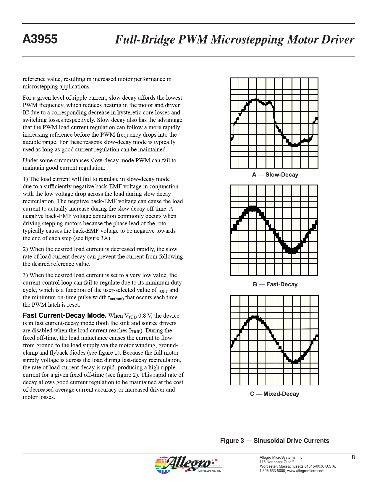 A3955Full-Bridge PWM Microstepping Motor Driver reference value, resulting in increased motor performance in microstepping applications. For a given level of ripple current, slow decay affords the lowest PWM frequency, which reduces heating in the motor and driver IC due to a corresponding decrease in hysteretic core losses and switching losses respectively. Slow decay also has the advantage that the PWM load current regulation can follow a more rapidly increasing reference before the PWM frequency drops into the audible range. For these reasons slow-decay mode is typically used as long as good current regulation can be maintained. Under some circumstances slow-decay mode PWM can fail to maintain good current regulation: A — Slow-Decay 1) The load current will fail to regulate in slow-decay mode due to a suffi ciently negative back-EMF voltage in conjunction with the low voltage drop across the load during slow decay recirculation. The negative back-EMF voltage can cause the load current to actually increase during the slow decay off time. A negative back-EMF voltage condition commonly occurs when driving stepping motors because the phase lead of the rotor typically causes the back-EMF voltage to be negative towards the end of each step (see fi gure 3A). 2) When the desired load current is decreased rapidly, the slow rate of load current decay can prevent the current from following the desired reference value. 3) When the desired load current is set to a very low value, the current-control loop can fail to regulate due to its minimum duty B — Fast-Decay cycle, which is a function of the user-selected value of tOFF and the minimum on-time pulse width ton(min) that occurs each time the PWM latch is reset. Fast Current-Decay Mode. When VPFD 0.8 V, the device is in fast current-decay mode (both the sink and source drivers are disabled when the load current reaches ITRIP). During the fi xed off-time, the load inductance causes the current to fl ow from ground to the load supply via the motor winding, ground- clamp and fl yback diodes (see fi gure 1). Because the full motor supply voltage is across the load during fast-decay recirculation, the rate of load current decay is rapid, producing a high ripple current for a given fi xed off-time (see fi gure 2). This rapid rate of decay allows good current regulation to be maintained at the cost of decreased average current accuracy or increased driver and motor losses. C — Mixed-DecayFigure 3 — Sinusoidal Drive Currents Allegro MicroSystems, Inc. 8 115 Northeast Cutoff Worcester, Massachusetts 01615-0036 U.S.A. 1.508.853.5000; www.allegromicro.com
