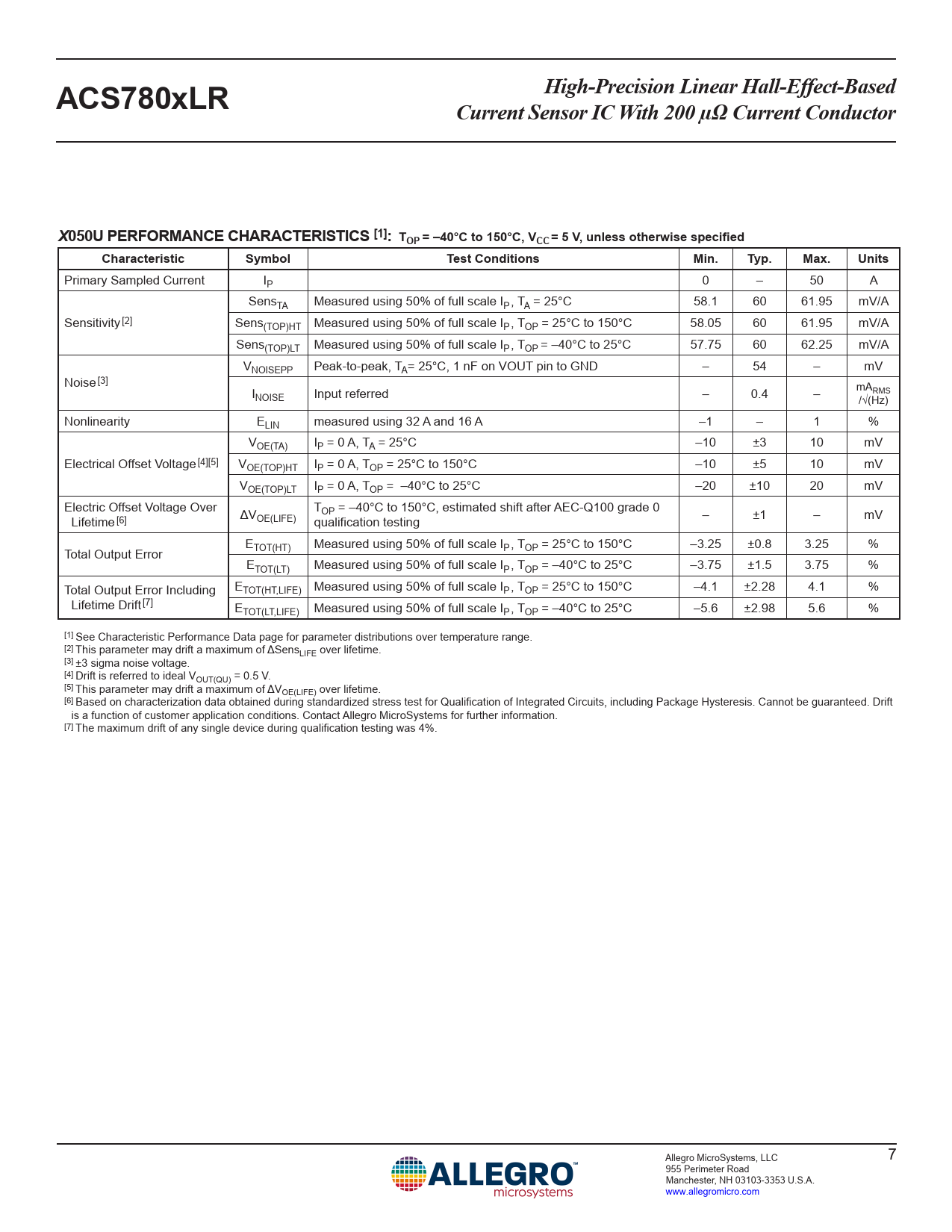 (Hz) Nonlinearity ELIN measured using 32 A and 16 A –1 – 1 % VOE(TA) IP = 0 A, TA = 25°C –10 ±3 10 mV Electrical Offset Voltage [4][5] VOE(TOP)HT IP = 0 A, TOP = 25°C to 150°C –10 ±5 10 mV VOE(TOP)LT IP = 0 A, TOP = –40°C to 25°C –20 ±10 20 mV Electric Offset Voltage Over TOP = –40°C to 150°C, estimated shift after AEC-Q100 grade 0 Lifetime [6] ΔVOE(LIFE) qualification testing – ±1 – mV E Total Output Error TOT(HT) Measured using 50% of full scale IP , TOP = 25°C to 150°C –3.25 ±0.8 3.25 % ETOT(LT) Measured using 50% of full scale IP , TOP = –40°C to 25°C –3.75 ±1.5 3.75 % Total Output Error Including ETOT(HT,LIFE) Measured using 50% of full scale IP , TOP = 25°C to 150°C –4.1 ±2.28 4.1 % Lifetime Drift [7] ETOT(LT,LIFE) Measured using 50% of full scale IP , TOP = –40°C to 25°C –5.6 ±2.98 5.6 % [1] See Characteristic Performance Data page for parameter distributions over temperature range. [2] This parameter may drift a maximum of ΔSensLIFE over lifetime. [3] ±3 sigma noise voltage. [4] Drift is referred to ideal VOUT(QU) = 0.5 V. [5] This parameter may drift a maximum of ΔVOE(LIFE) over lifetime. [6] Based on characterization data obtained during standardized stress test for Qualification of Integrated Circuits, including Package Hysteresis. Cannot be guaranteed. Drift is a function of customer application conditions. Contact Allegro MicroSystems for further information. [7] The maximum drift of any single device during qualification testing was 4%. Allegro MicroSystems, LLC 7 955 Perimeter Road Manchester, NH 03103-3353 U.S.A. www.allegromicro.com
