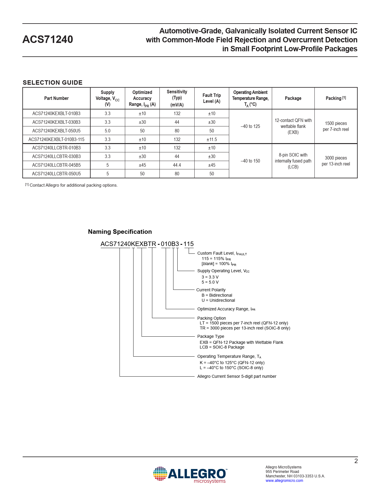 Línea de modelo para esta hoja de datos Versión de texto del documento Automotive-Grade, Galvanically Isolated Current Sensor IC ACS71240 with Common-Mode Field Rejection and Overcurrent Detection in Small Footprint Low-Profile Packages SELECTION GUIDE Supply Optimized Sensitivity Operating Ambient Part Number Voltage, V Fault Trip CC Accuracy (Typ) Temperature Range, Package Packing [1] (V) Range, I Level (A) PR (A) (mV/A) TA (°C) ACS71240KEXBLT-010B3 3.3 ±10 132 ±10 12-contact QFN with ACS71240KEXBLT-030B3 3.3 ±30 44 ±30 –40 to 125 wettable flank 1500 pieces ACS71240KEXBLT-050U5 5.0 50 80 50 (EXB) per 7-inch reel ACS71240KEXBLT-010B3-115 3.3 ±10 132 ±11.5 ACS71240LLCBTR-010B3 3.3 ±10 132 ±10 8-pin SOIC with ACS71240LLCBTR-030B3 3.3 ±30 44 ±30 –40 to 150 internally fused path 3000 pieces ACS71240LLCBTR-045B5 5 ±45 44.4 ±45 (LCB) per 13-inch reel ACS71240LLCBTR-050U5 5 50 80 50 [1] Contact Allegro for additional packing options.Naming Specification ACS71240KEXBTR- 010B3- 115 Custom Fault Level, IFAULT 115 = 115% IPR [blank] = 100% IPR Supply Operating Level, VCC 3 = 3.3 V 5 = 5.0 V Current Polarity B = Bidirectional U = Unidirectional Optimized Accuracy Range, IPR Packing Option LT = 1500 pieces per 7-inch reel (QFN-12 only) TR = 3000 pieces per 13-inch reel (SOIC-8 only) Package Type EXB = QFN-12 Package with Wettable Flank LCB = SOIC-8 Package Operating Temperature Range, TA K = –40°C to 125°C (QFN-12 only) L = –40°C to 150°C (SOIC-8 only) Al egro Current Sensor 5-digit part number 2 Allegro MicroSystems 955 Perimeter Road Manchester, NH 03103-3353 U.S.A. www.allegromicro.com