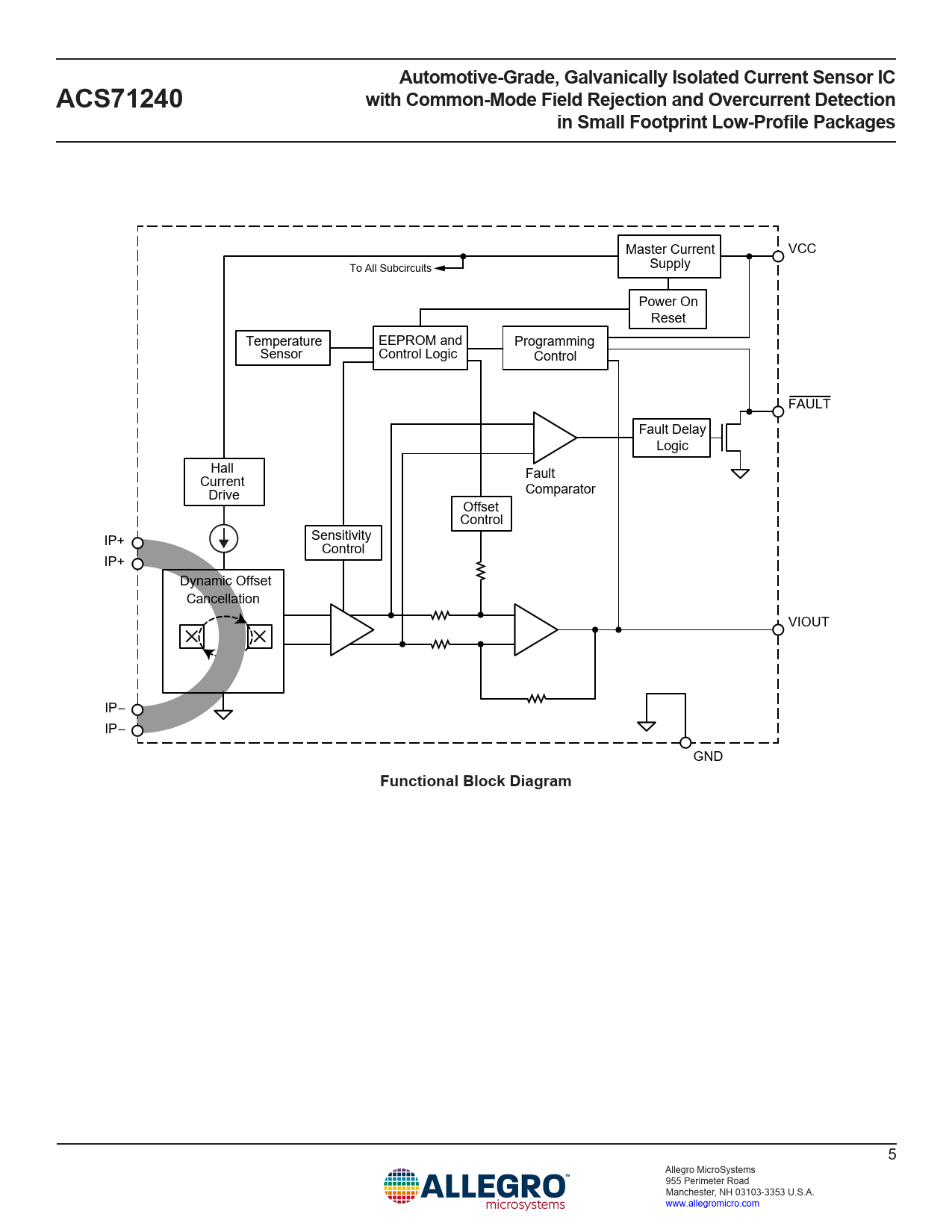 Automotive-Grade, Galvanically Isolated Current Sensor ICACS71240with Common-Mode Field Rejection and Overcurrent Detectionin Small Footprint Low-Profile Packages Master Current VCC To All Subcircuits Supply Power On Reset Temperature EEPROM and Programming Sensor Control Logic Control FAULT Fault Delay Logic Hall Current Fault Drive Comparator Offset Control Sensitivity IP+ Control IP+ Dynamic Offset Cancellation VIOUT IP– IP– GND Functional Block Diagram 5 Allegro MicroSystems 955 Perimeter Road Manchester, NH 03103-3353 U.S.A. www.allegromicro.com
