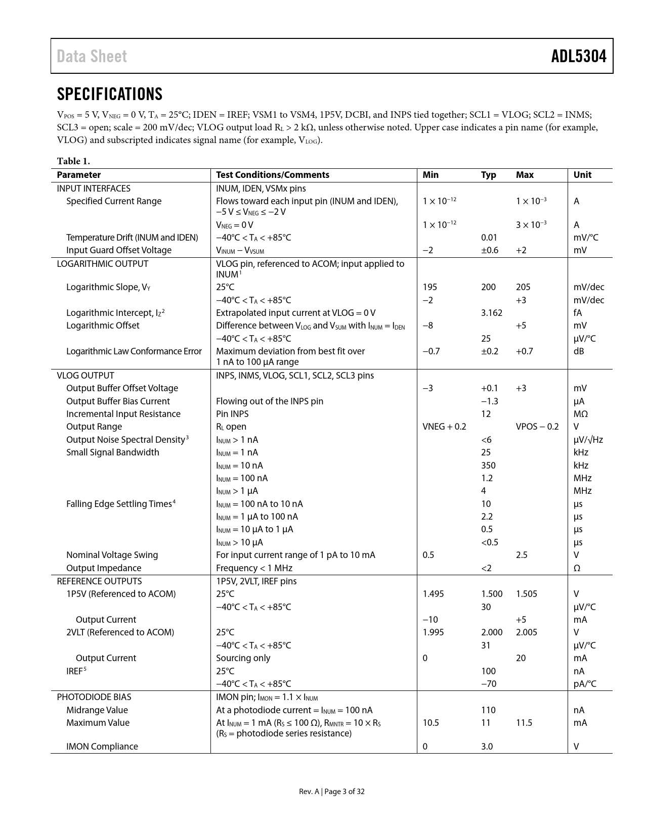 Páginas / Página32 / 3 — Data Sheet. ADL5304. SPECIFICATIONS. Table 1. Parameter. Test …