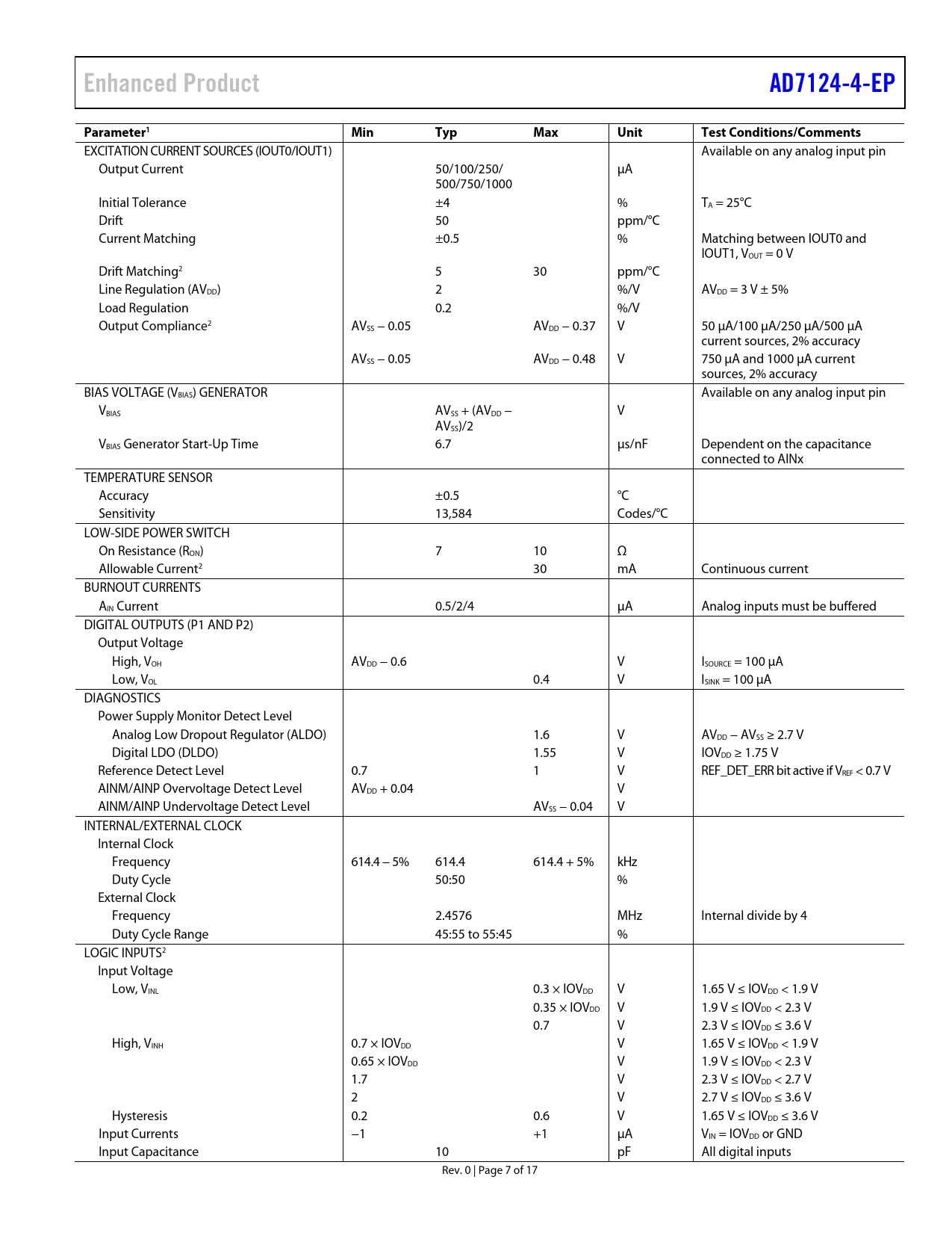 link to page 9 link to page 9 link to page 9 link to page 9 link to page 9 Enhanced ProductAD7124-4-EPParameter1 MinTypMaxUnitTestConditions/Comments EXCITATION CURRENT SOURCES (IOUT0/IOUT1) Available on any analog input pin Output Current 50/100/250/ μA 500/750/1000 Initial Tolerance ±4 % TA = 25°C Drift 50 ppm/°C Current Matching ±0.5 % Matching between IOUT0 and IOUT1, VOUT = 0 V Drift Matching2 5 30 ppm/°C Line Regulation (AVDD) 2 %/V AVDD = 3 V ± 5% Load Regulation 0.2 %/V Output Compliance2 AVSS − 0.05 AVDD − 0.37 V 50 μA/100 μA/250 μA/500 μA current sources, 2% accuracy AVSS − 0.05 AVDD − 0.48 V 750 μA and 1000 μA current sources, 2% accuracy BIAS VOLTAGE (VBIAS) GENERATOR Available on any analog input pin VBIAS AVSS + (AVDD − V AVSS)/2 VBIAS Generator Start-Up Time 6.7 μs/nF Dependent on the capacitance connected to AINx TEMPERATURE SENSOR Accuracy ±0.5 °C Sensitivity 13,584 Codes/°C LOW-SIDE POWER SWITCH On Resistance (RON) 7 10 Ω Allowable Current2 30 mA Continuous current BURNOUT CURRENTS AIN Current 0.5/2/4 μA Analog inputs must be buffered DIGITAL OUTPUTS (P1 AND P2) Output Voltage High, VOH AVDD − 0.6 V ISOURCE = 100 μA Low, VOL 0.4 V ISINK = 100 μA DIAGNOSTICS Power Supply Monitor Detect Level Analog Low Dropout Regulator (ALDO) 1.6 V AVDD − AVSS ≥ 2.7 V Digital LDO (DLDO) 1.55 V IOVDD ≥ 1.75 V Reference Detect Level 0.7 1 V REF_DET_ERR bit active if VREF < 0.7 V AINM/AINP Overvoltage Detect Level AVDD + 0.04 V AINM/AINP Undervoltage Detect Level AVSS − 0.04 V INTERNAL/EXTERNAL CLOCK Internal Clock Frequency 614.4 − 5% 614.4 614.4 + 5% kHz Duty Cycle 50:50 % External Clock Frequency 2.4576 MHz Internal divide by 4 Duty Cycle Range 45:55 to 55:45 % LOGIC INPUTS2 Input Voltage Low, VINL 0.3 × IOVDD V 1.65 V ≤ IOVDD < 1.9 V 0.35 × IOVDD V 1.9 V ≤ IOVDD < 2.3 V 0.7 V 2.3 V ≤ IOVDD ≤ 3.6 V High, VINH 0.7 × IOVDD V 1.65 V ≤ IOVDD < 1.9 V 0.65 × IOVDD V 1.9 V ≤ IOVDD < 2.3 V 1.7 V 2.3 V ≤ IOVDD < 2.7 V 2 V 2.7 V ≤ IOVDD ≤ 3.6 V Hysteresis 0.2 0.6 V 1.65 V ≤ IOVDD ≤ 3.6 V Input Currents −1 +1 μA VIN = IOVDD or GND Input Capacitance 10 pF All digital inputs Rev. 0 | Page 7 of 17 Document Outline FEATURES ENHANCED PRODUCT FEATURES APPLICATIONS FUNCTIONAL BLOCK DIAGRAM TABLE OF CONTENTS REVISION HISTORY GENERAL DESCRIPTION SPECIFICATIONS ABSOLUTE MAXIMUM RATINGS THERMAL RESISTANCE ESD CAUTION PIN CONFIGURATION AND FUNCTION DESCRIPTIONS TYPICAL PERFORMANCE CHARACTERISTICS OUTLINE DIMENSIONS ORDERING GUIDE