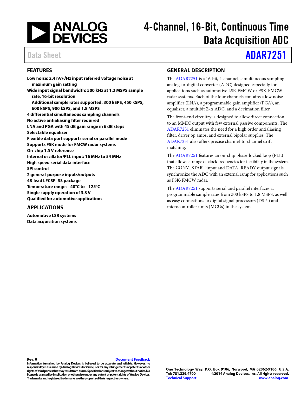 Automotive LSR systems Data acquisition systems Rev. 0 Document Feedback Information furnished by Analog Devices is believed to be accurate and reliable. However, no responsibility is assumed by Analog Devices for its use, nor for any infringements of patents or other rights of third parties that may result from its use. Specifications subject to change without notice. No One Technology Way, P.O. Box 9106, Norwood, MA 02062-9106, U.S.A. license is granted by implication or otherwise under any patent or patent rights of Analog Devices. Tel: 781.329.4700 ©2014 Analog Devices, Inc. All rights reserved. Trademarks and registered trademarks are the property of their respective owners. Technical Support www.analog.com
