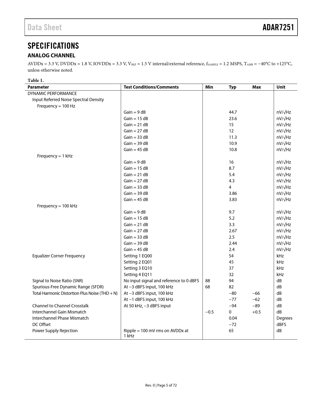 Data SheetADAR7251SPECIFICATIONS ANALOG CHANNEL AVDDx = 3.3 V, DVDDx = 1.8 V, IOVDDx = 3.3 V, VREF = 1.5 V internal/external reference, fSAMPLE = 1.2 MSPS, TAMB = −40°C to +125°C, unless otherwise noted. Table 1. ParameterTest Conditions/CommentsMinTypMaxUnit DYNAMIC PERFORMANCE Input Referred Noise Spectral Density Frequency = 100 Hz Gain = 9 dB 44.7 nV/√Hz Gain = 15 dB 23.6 nV/√Hz Gain = 21 dB 15 nV/√Hz Gain = 27 dB 12 nV/√Hz Gain = 33 dB 11.3 nV/√Hz Gain = 39 dB 10.9 nV/√Hz Gain = 45 dB 10.8 nV/√Hz Frequency = 1 kHz Gain = 9 dB 16 nV/√Hz Gain = 15 dB 8.7 nV/√Hz Gain = 21 dB 5.4 nV/√Hz Gain = 27 dB 4.3 nV/√Hz Gain = 33 dB 4 nV/√Hz Gain = 39 dB 3.86 nV/√Hz Gain = 45 dB 3.83 nV/√Hz Frequency = 100 kHz Gain = 9 dB 9.7 nV/√Hz Gain = 15 dB 5.2 nV/√Hz Gain = 21 dB 3.3 nV/√Hz Gain = 27 dB 2.67 nV/√Hz Gain = 33 dB 2.5 nV/√Hz Gain = 39 dB 2.44 nV/√Hz Gain = 45 dB 2.4 nV/√Hz Equalizer Corner Frequency Setting 1 EQ00 54 kHz Setting 2 EQ01 45 kHz Setting 3 EQ10 37 kHz Setting 4 EQ11 32 kHz Signal to Noise Ratio (SNR) No input signal and reference to 0 dBFS 88 94 dB Spurious-Free Dynamic Range (SFDR) At −3 dBFS input, 100 kHz 68 82 dB Total Harmonic Distortion Plus Noise (THD + N) At −3 dBFS input, 100 kHz −80 −66 dB At −1 dBFS input, 100 kHz −77 −62 dB Channel to Channel Crosstalk At 50 kHz, −3 dBFS input −94 −89 dB Interchannel Gain Mismatch −0.5 0 +0.5 dB Interchannel Phase Mismatch 0.04 Degrees DC Offset −72 dBFS Power Supply Rejection Ripple = 100 mV rms on AVDDx at 65 dB 1 kHz Rev. 0 | Page 5 of 72 Document Outline Features Applications General Description Revision History Functional Block Diagram Specifications Analog Channel Digital Input/Output Power Supply Digital Filter SPI Port Timing Serial/Peripheral Parallel Interface (PPI) Port Timing Timing Diagrams Absolute Maximum Ratings Thermal Resistance ESD Caution Pin Configuration and Function Descriptions Typical Performance Characteristics Terminology Theory of Operation Low Speed Ramp Radar Analog Front End Main Channel Overview Σ-∆ Modulation and Digital Filtering Differential Input Configuration High-Pass Filter (HPF) Low-Pass Filter (LPF) Input Routing Equalizer (EQ) Using LNA/PGA, EQ, or the Input Capacitor Reference Auxiliary ADC Power Supply LDO Clock Requirements Crystal Oscillator PLL Integer Mode Fractional Mode PLL Lock Acquisition GPIO ADC Data Port ADC Serial Mode ADC Serial Master Mode ADC Serial Master Mode with ADC Serial Slave ADC PPI (Byte Wide Mode) ADC PPI Nibble Wide Mode DAQ Mode Using Multiple ADAR7251 Devices for Systems with More Than Four Channels Device Address R/ Register Address Data Bytes CRC PCB Layout Guidelines Register Summary Register Details Clock Control Register PLL Denominator Register PLL Numerator Register PLL Control Register PLL Status Register Master Enable Switch Register ADC Enable Register Power Enable Register Clear the ASIL errors Register Selects Which Errors to Mask Register ASIL Error Flag Register ASIL Error Code Register CRC Value, Bits[7:0] Register CRC Value Register Start Calculating the CRC Value of the Register Map Content Register Register Map CRC Calculation Done Register Register Map CRC Value, Bits[7:0] Register Register Map CRC Value, Bits[15:8] Register Low Noise Amplifier Gain Control Register Programmable Gain Amplifier Gain Control Register Signal Path for ADC 1 Through ADC 4 Register Decimator Rate Control Register High Pass Filter Control Register DAQ Mode Control Register Decimator Truncate Control Register Serial Output Port Control Register Parallel Port Control Register ADC Digital Output Mode Register Auxiliary ADC Read Value Registers Auxiliary ADC Sample Rate Selection Register Auxiliary ADC Mode Register MPx Pin Modes Registers MP Write Value Registers MP Read Value Registers SPI_CLK Pin Drive Strength and Slew Rate Register SPI_MISO Pin Drive Strength and Slew Rate Register Pin Drive Strength and Slew Rate Register SPI_MOSI Pin Drive Strength and Slew Rate Register ADDR15 Pin Drive Strength and Slew Rate Register Pin Drive Strength and Slew Rate Register FS_ADC Pin Drive Strength and Slew Rate Register Pin Drive Strength and Slew Rate Register SCLK_ADC Pin Drive Strength and Slew Rate Register ADC_DOUTx Pins Drive Strength and Slew Rate Registers DATA_READY Pin Drive Strength and Slew Rate Register XTAL Enable and Drive Register ADC Test Register Digital Filter Sync Enable Register CRC Enable/Disable Register Typical Application Circuit Outline Dimensions Ordering Guide Automotive Products