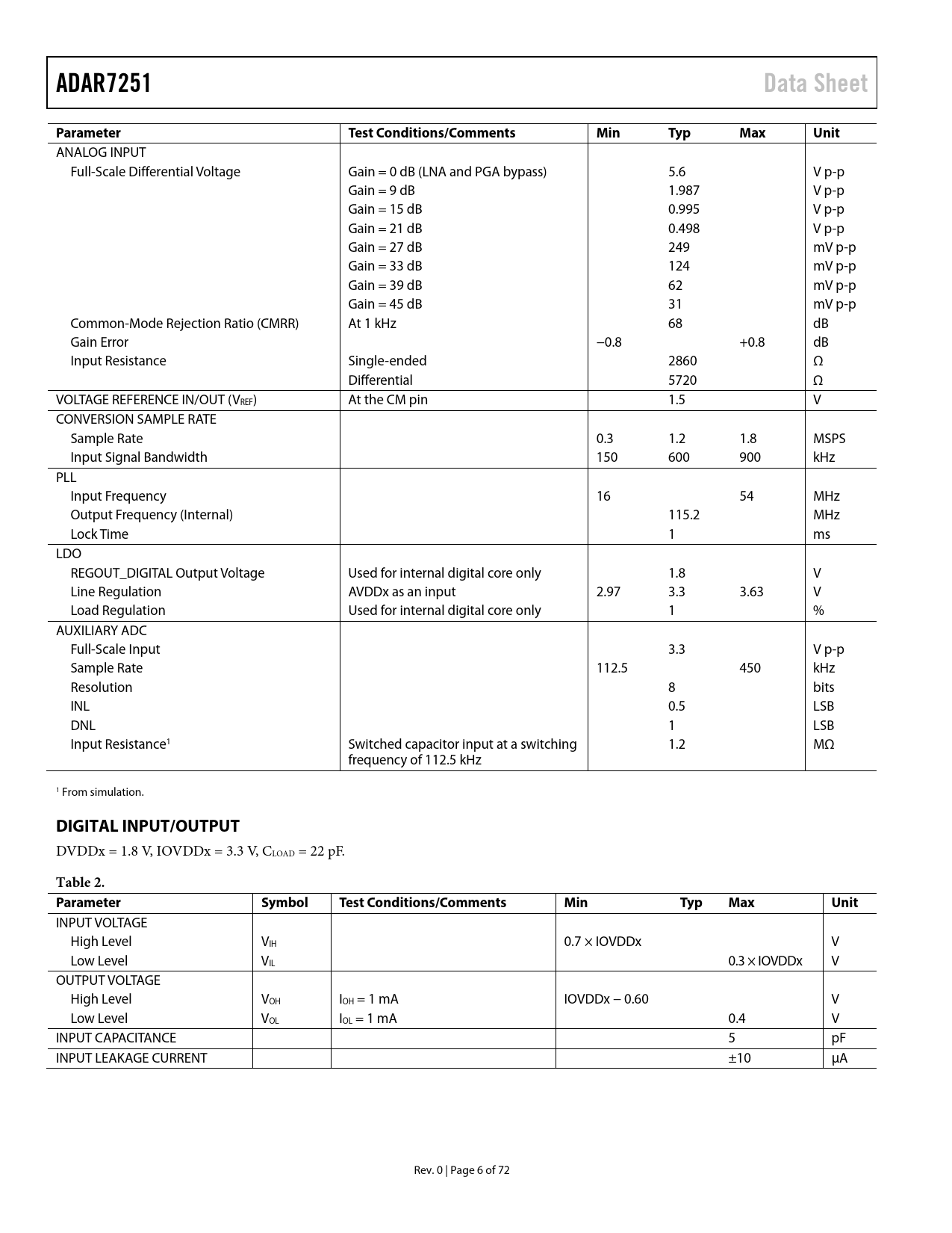ADAR7251. Data Sheet. Parameter. Test Conditions/Comments. Min. Typ. Max. Unit. DIGITAL INPUT/OUTPUT. Table 2. Parameter Symbol. Test