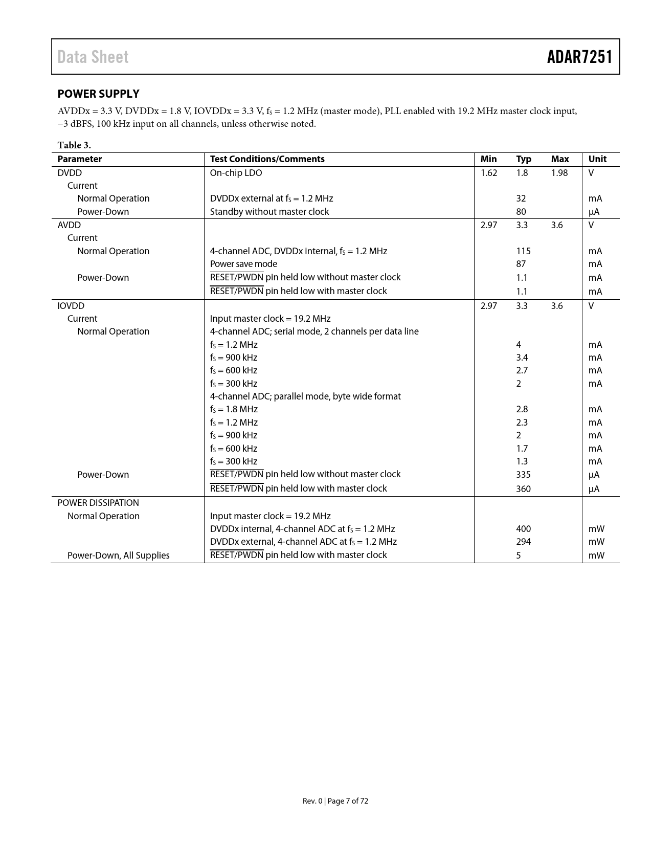 Data Sheet. ADAR7251. POWER SUPPLY. Table 3. Parameter Test. Conditions/Comments. Min. Typ. Max. Unit