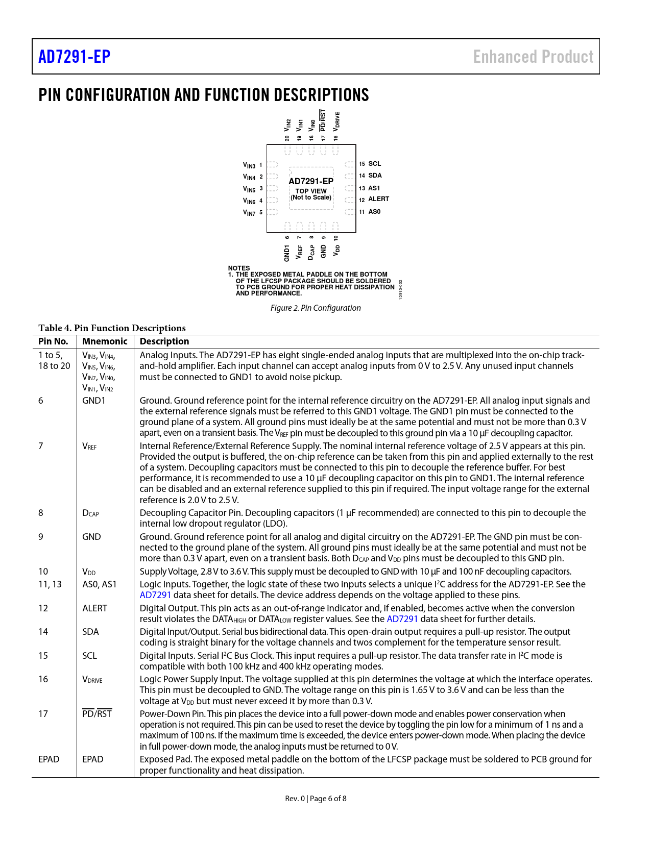 Páginas / Página8 / 6 — AD7291-EP. Enhanced Product. PIN CONFIGURATION AND FUNCTION DESCRIPTIONS. …