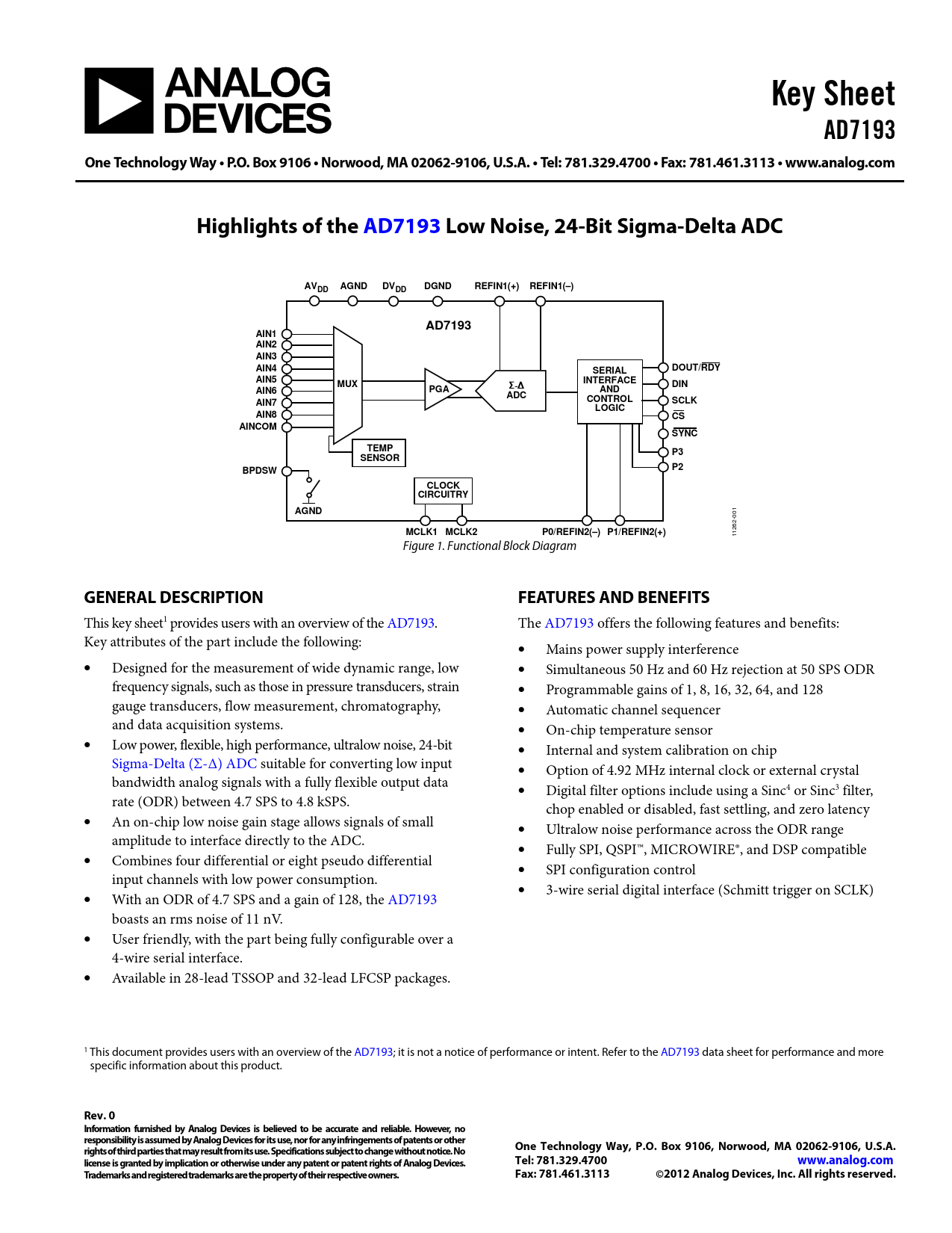 This key sheet1 provides users with an overview of the AD7193. The AD7193 offers the following features and benefits: Key attributes of the part include the fol owing: • Mains power supply interference • Designed for the measurement of wide dynamic range, low • Simultaneous 50 Hz and 60 Hz rejection at 50 SPS ODR frequency signals, such as those in pressure transducers, strain • Programmable gains of 1, 8, 16, 32, 64, and 128 gauge transducers, flow measurement, chromatography, • Automatic channel sequencer and data acquisition systems. • On-chip temperature sensor • Low power, flexible, high performance, ultralow noise, 24-bit • Internal and system calibration on chip Sigma-Delta (Σ-Δ) ADC suitable for converting low input • Option of 4.92 MHz internal clock or external crystal bandwidth analog signals with a fully flexible output data • Digital filter options include using a Sinc4 or Sinc3 filter, rate (ODR) between 4.7 SPS to 4.8 kSPS. chop enabled or disabled, fast settling, and zero latency • An on-chip low noise gain stage allows signals of small • Ultralow noise performance across the ODR range amplitude to interface directly to the ADC. • • Fully SPI, QSPI™, MICROWIRE®, and DSP compatible Combines four differential or eight pseudo differential • input channels with low power consumption. SPI configuration control • • 3-wire serial digital interface (Schmitt trigger on SCLK) With an ODR of 4.7 SPS and a gain of 128, the AD7193 boasts an rms noise of 11 nV. • User friendly, with the part being fully configurable over a 4-wire serial interface. • Available in 28-lead TSSOP and 32-lead LFCSP packages. 1 This document provides users with an overview of the AD7193; it is not a notice of performance or intent. Refer to the AD7193 data sheet for performance and more specific information about this product.