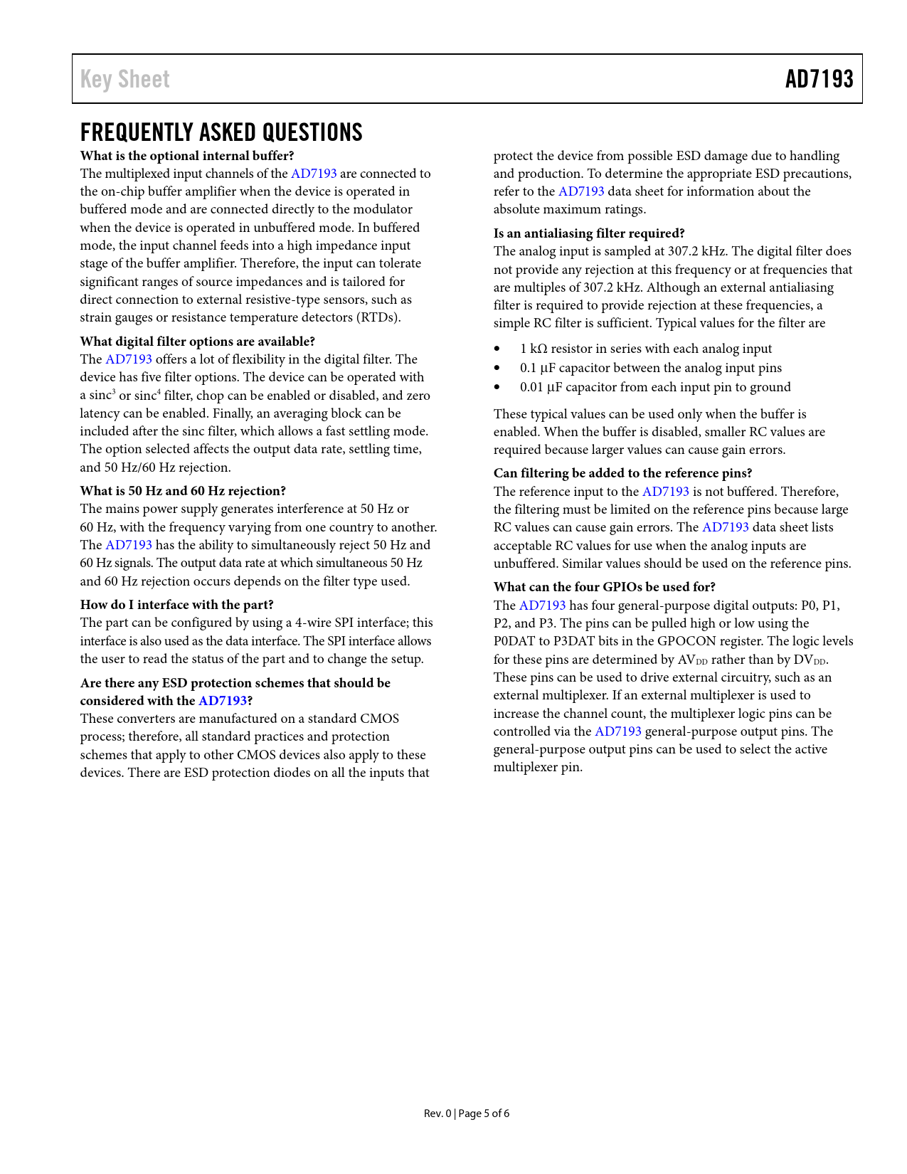 Key Sheet. AD7193. FREQUENTLY ASKED QUESTIONS What is the optional internal buffer?. Is an antialiasing filter required?