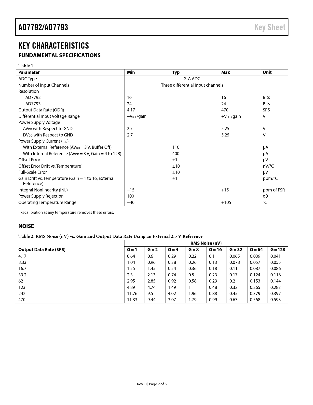 AD7792/AD7793 Key Sheet KEY CHARACTERISTICS FUNDAMENTAL SPECIFICATIONS Table 1. Parameter Min Typ Max Unit