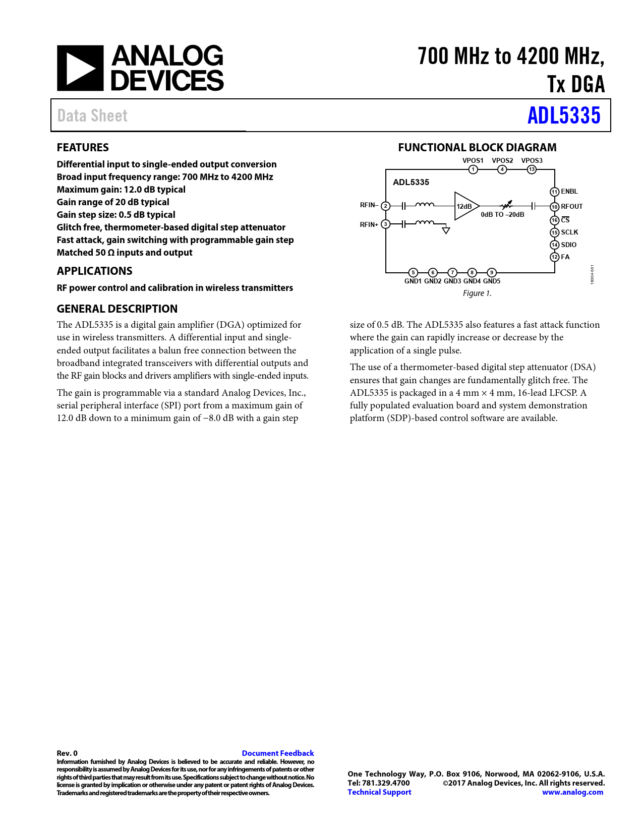700 MHz to 4200 MHz,. Tx DGA. Data Sheet. ADL5335. FEATURES. FUNCTIONAL BLOCK DIAGRAM. VPOS1. VPOS2. VPOS3