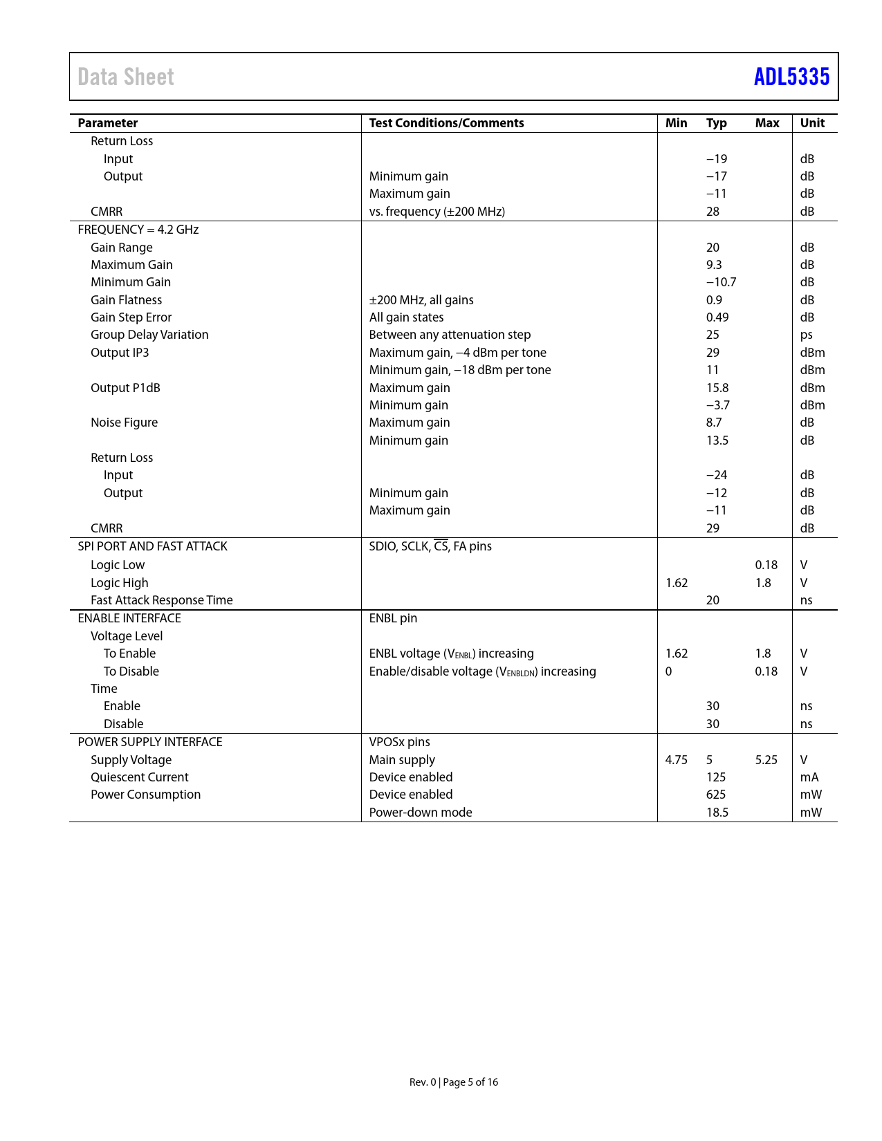 Return Loss Input −19 dB Output Minimum gain −17 dB Maximum gain −11 dB CMRR vs. frequency (±200 MHz) 28 dB FREQUENCY = 4.2 GHz Gain Range 20 dB Maximum Gain 9.3 dB Minimum Gain −10.7 dB Gain Flatness ±200 MHz, all gains 0.9 dB Gain Step Error All gain states 0.49 dB Group Delay Variation Between any attenuation step 25 ps Output IP3 Maximum gain, −4 dBm per tone 29 dBm Minimum gain, −18 dBm per tone 11 dBm Output P1dB Maximum gain 15.8 dBm Minimum gain −3.7 dBm Noise Figure Maximum gain 8.7 dB Minimum gain 13.5 dB Return Loss Input −24 dB Output Minimum gain −12 dB Maximum gain −11 dB CMRR 29 dB SPI PORT AND FAST ATTACK SDIO, SCLK, CS, FA pins Logic Low 0.18 V Logic High 1.62 1.8 V Fast Attack Response Time 20 ns ENABLE INTERFACE ENBL pin Voltage Level To Enable ENBL voltage (VENBL) increasing 1.62 1.8 V To Disable Enable/disable voltage (VENBLDN) increasing 0 0.18 V Time Enable 30 ns Disable 30 ns POWER SUPPLY INTERFACE VPOSx pins Supply Voltage Main supply 4.75 5 5.25 V Quiescent Current Device enabled 125 mA Power Consumption Device enabled 625 mW Power-down mode 18.5 mW Rev. 0 | Page 5 of 16 Document Outline FEATURES APPLICATIONS FUNCTIONAL BLOCK DIAGRAM GENERAL DESCRIPTION TABLE OF CONTENTS REVISION HISTORY SPECIFICATIONS DIGITAL LOGIC TIMING SPI Timing Diagram ABSOLUTE MAXIMUM RATINGS THREMAL RESISTANCE ESD CAUTION PIN CONFIGURATION AND FUNCTION DESCRIPTIONS TYPICAL PERFORMANCE CHARACTERISTICS THEORY OF OPERATION BASIC STRUCTURE DIGITAL INTERFACE OVERVIEW Serial Peripheral Interface (SPI) Fast Attack (FA) APPLICATIONS INFORMATION BASIC CONNECTIONS OUTLINE DIMENSIONS ORDERING GUIDE
