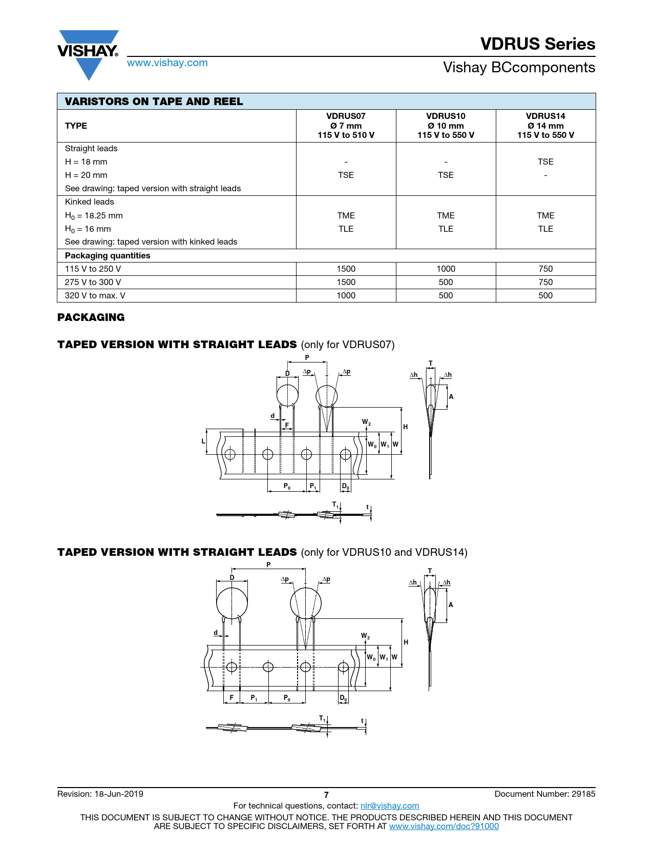 VDRUS Series VARISTORS ON TAPE AND REEL VDRUS07 VDRUS10 VDRUS14 TYPE Ø 7 mm Ø 10 mm Ø 14 mm 115 V to 510 V 115 V to 550 V