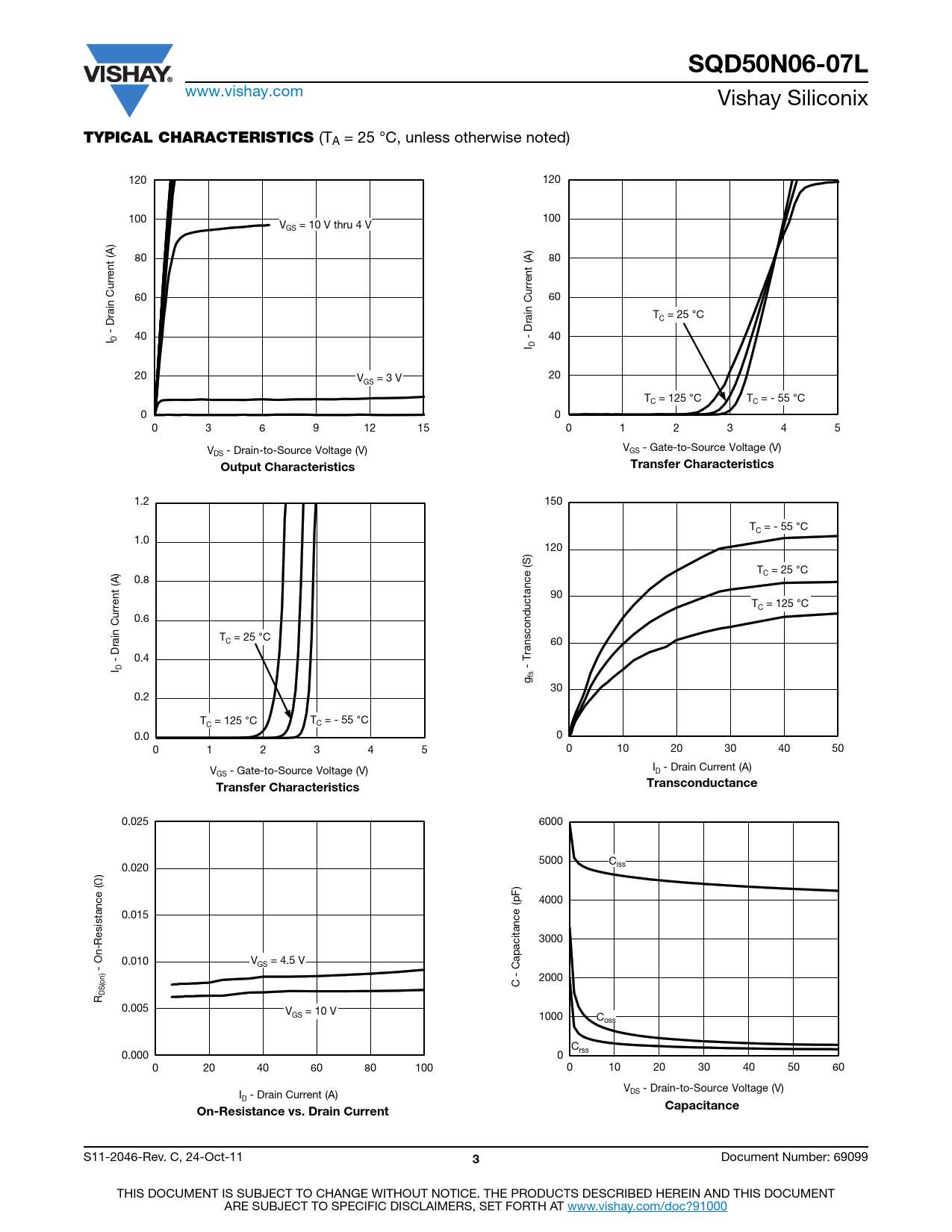 SQD50N06-07L www.vishay.com Vishay Siliconix TYPICAL CHARACTERISTICS (TA = 25 °C, unless otherwise noted) 120 120 100 100 V = 10 V thru 4 V GS ) (A ) 80 (A 80 rrent u rrent u C 60 60 n C n rai T = 25 °C D rai C - D 40 - I D 40 I D 20 V = 3 V 20 GS T = 125 °C T = - 55 °C C C 0 0 0 3 6 9 12 15 0 1 2 3 4 5 V - Drain-to-Source Voltage (V) V - Gate-to-Source Voltage (V) DS GS Output CharacteristicsTransferCharacteristics 1.2 150 T = - 55 °C C 1.0 120 ) S ) e ( T = 25 °C C 0.8 (A nc a 90 rrent T = 125 °C C u 0.6 C n conduct T = 25 °C s rai C n 60 D ra - 0.4 I D -T fsg 30 0.2 T = 125 °C T = - 55 °C C C 0.0 0 0 1 2 3 4 5 0 10 20 30 40 50 V - Gate-to-Source Voltage (V) I - Drain Current (A) D GS TransferCharacteristicsTransconductance 0.025 6000 5000 C 0.020 iss ) (pF) 4000 tance (Ω 0.015 is s e 3000 -R n 0.010 V = 4.5 V apacitance -O GS C ) n 2000 (o C - S DR 0.005 V = 10 V GS 1000 Coss C 0.000 rss 0 0 20 40 60 80 100 0 10 20 30 40 50 60 V - Drain-to-Source Voltage (V) I - Drain Current (A) DS D CapacitanceOn-Resistance vs. Drain Current S11-2046-Rev. C, 24-Oct-11 3 Document Number: 69099 THIS DOCUMENT IS SUBJECT TO CHANGE WITHOUT NOTICE. THE PRODUCTS DESCRIBED HEREIN AND THIS DOCUMENT ARE SUBJECT TO SPECIFIC DISCLAIMERS, SET FORTH AT www.vishay.com/doc?91000