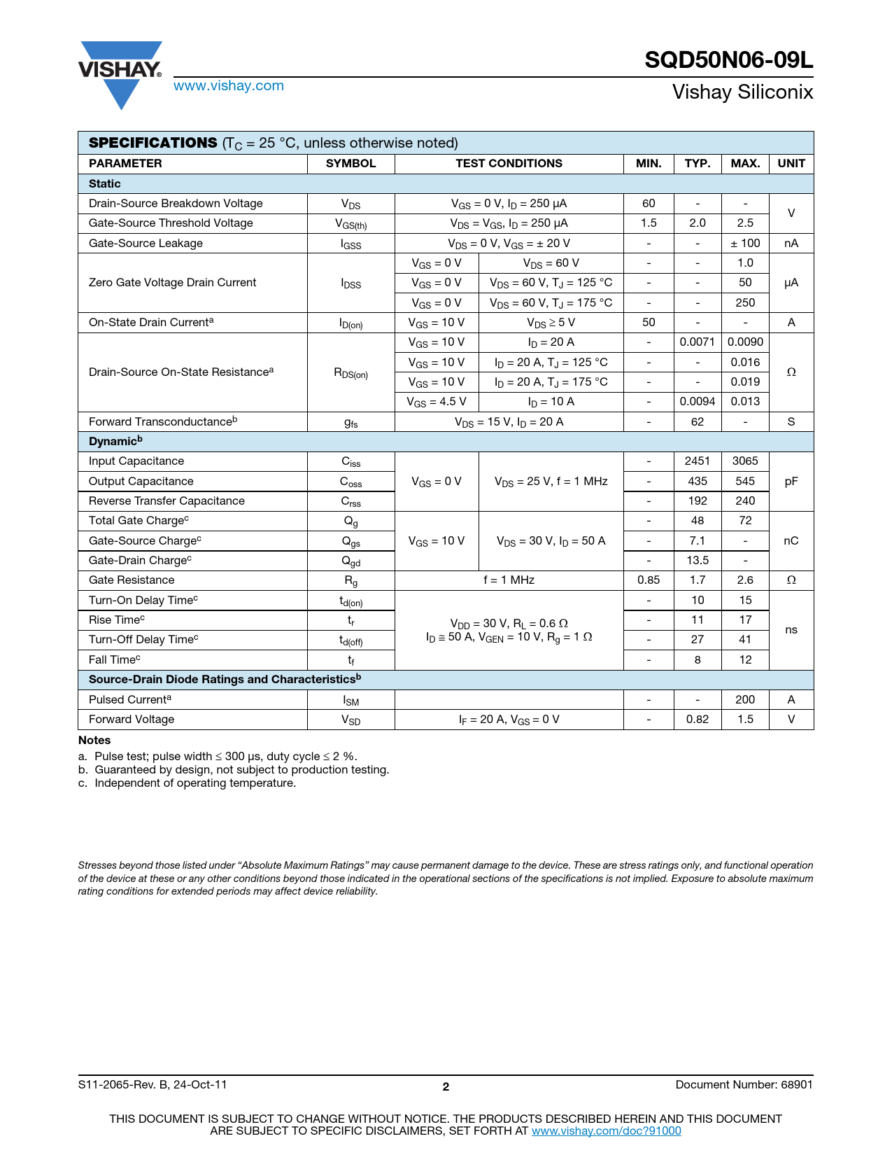 SQD50N06-09L www.vishay.com Vishay Siliconix SPECIFICATIONS (TC = 25 °C, unless otherwise noted) PARAMETER SYMBOLTESTCONDITIONS MIN.TYP.MAX.UNITStatic Drain-Source Breakdown Voltage VDS VGS = 0 V, ID = 250 μA 60 - - V Gate-Source Threshold Voltage VGS(th) VDS = VGS, ID = 250 μA 1.5 2.0 2.5 Gate-Source Leakage IGSS VDS = 0 V, VGS = ± 20 V - - ± 100 nA VGS = 0 V VDS = 60 V - - 1.0 Zero Gate Voltage Drain Current IDSS VGS = 0 V VDS = 60 V, TJ = 125 °C - - 50 μA VGS = 0 V VDS = 60 V, TJ = 175 °C - - 250 On-State Drain Currenta I D(on) VGS = 10 V VDS 5 V 50 - - A VGS = 10 V ID = 20 A - 0.0071 0.0090 VGS = 10 V ID = 20 A, TJ = 125 °C - - 0.016 Drain-Source On-State Resistancea R DS(on) VGS = 10 V ID = 20 A, TJ = 175 °C - - 0.019 VGS = 4.5 V ID = 10 A - 0.0094 0.013 Forward Transconductanceb gfs VDS = 15 V, ID = 20 A - 62 - S Dynamicb Input Capacitance Ciss - 2451 3065 Output Capacitance Coss VGS = 0 V VDS = 25 V, f = 1 MHz - 435 545 pF Reverse Transfer Capacitance Crss - 192 240 Total Gate Chargec Qg - 48 72 Gate-Source Chargec Qgs VGS = 10 V VDS = 30 V, ID = 50 A - 7.1 - nC Gate-Drain Chargec Qgd - 13.5 - Gate Resistance Rg f = 1 MHz 0.85 1.7 2.6 Turn-On Delay Timec td(on) - 10 15 Rise Timec tr V - 11 17 DD = 30 V, RL = 0.6 ns I Turn-Off Delay Timec t D 50 A, VGEN = 10 V, Rg = 1 d(off) - 27 41 Fall Timec tf - 8 12 Source-Drain Diode Ratings and Characteristicsb Pulsed Currenta ISM - - 200 A Forward Voltage VSD IF = 20 A, VGS = 0 V - 0.82 1.5 V Notes a. Pulse test; pulse width 300 μs, duty cycle 2 %. b. Guaranteed by design, not subject to production testing. c. Independent of operating temperature. Stresses beyond those listed under “Absolute Maximum Ratings” may cause permanent damage to the device. These are stress ratings only, and functional operation of the device at these or any other conditions beyond those indicated in the operational sections of the specifications is not implied. Exposure to absolute maximum rating conditions for extended periods may affect device reliability. S11-2065-Rev. B, 24-Oct-11 2 Document Number: 68901 THIS DOCUMENT IS SUBJECT TO CHANGE WITHOUT NOTICE. THE PRODUCTS DESCRIBED HEREIN AND THIS DOCUMENT ARE SUBJECT TO SPECIFIC DISCLAIMERS, SET FORTH AT www.vishay.com/doc?91000